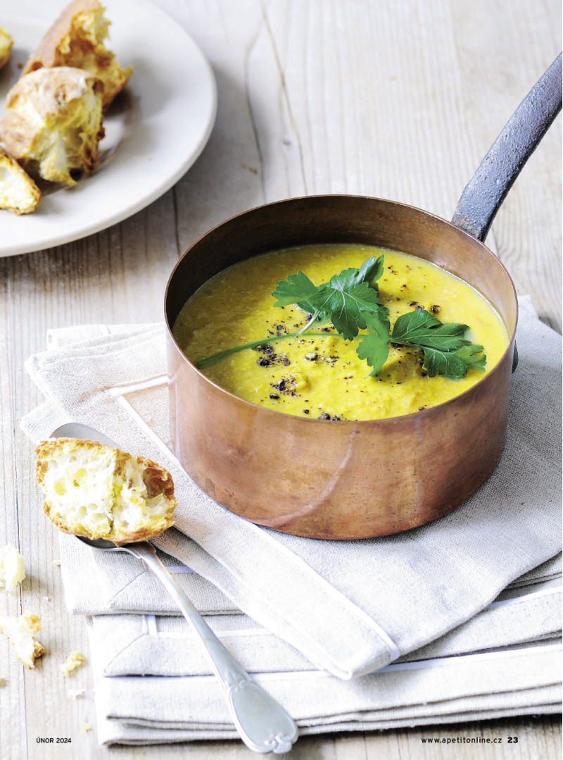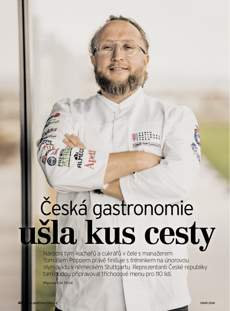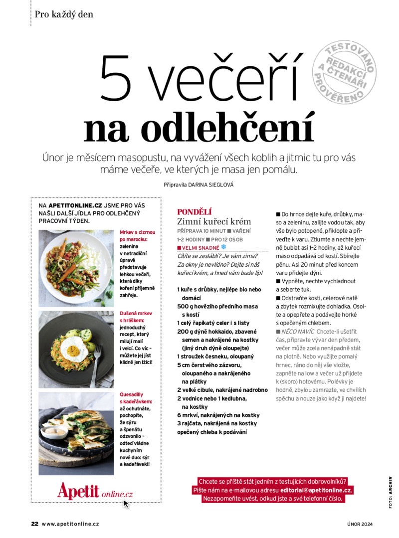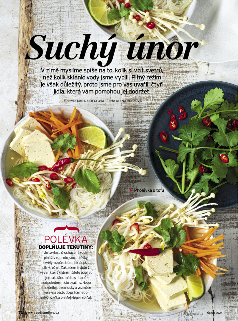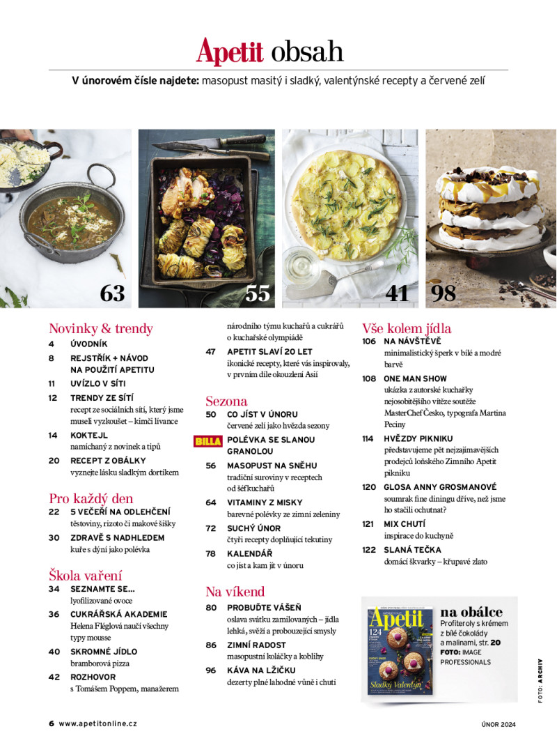 Únorové vydání Apetitu, které vychází 18. 1., vás uprostřed chladné zimy zahřeje u srdce. O místo na vašem stole budou bojovat pestré krémové polévky a surovina měsíce – červené zelí. Milovníci tradiční české kuchyně v moderním kabátu jistě ocení masopustní speciality v podání šéfkuchařů z Národního týmu kuchařů a cukrářů a ukázku z kuchařky Jazyk, srdce, mozek, krev loňského vítěze soutěže MasterChef Martina Peciny. Necháte se svést afrodiziakálním valentýnským menu nebo snad okouzlit francouzskými mousse v podání Heleny Fléglové? Třeba svou touhu po sladkém ukojíte rafinovanými kávovými dezerty nebo bohatými masopustními moučníky, mezi nimiž se skrývá i jeden slaný favorit – hříšně dobré koblihy s červeným zelím, uzeným a křenem. Nepochybně oceníte i praktické tipy na lahodné rychlé večeře pro všední dny či na pokrmy, které vám během zimy pomohou dodržet pitný režim.