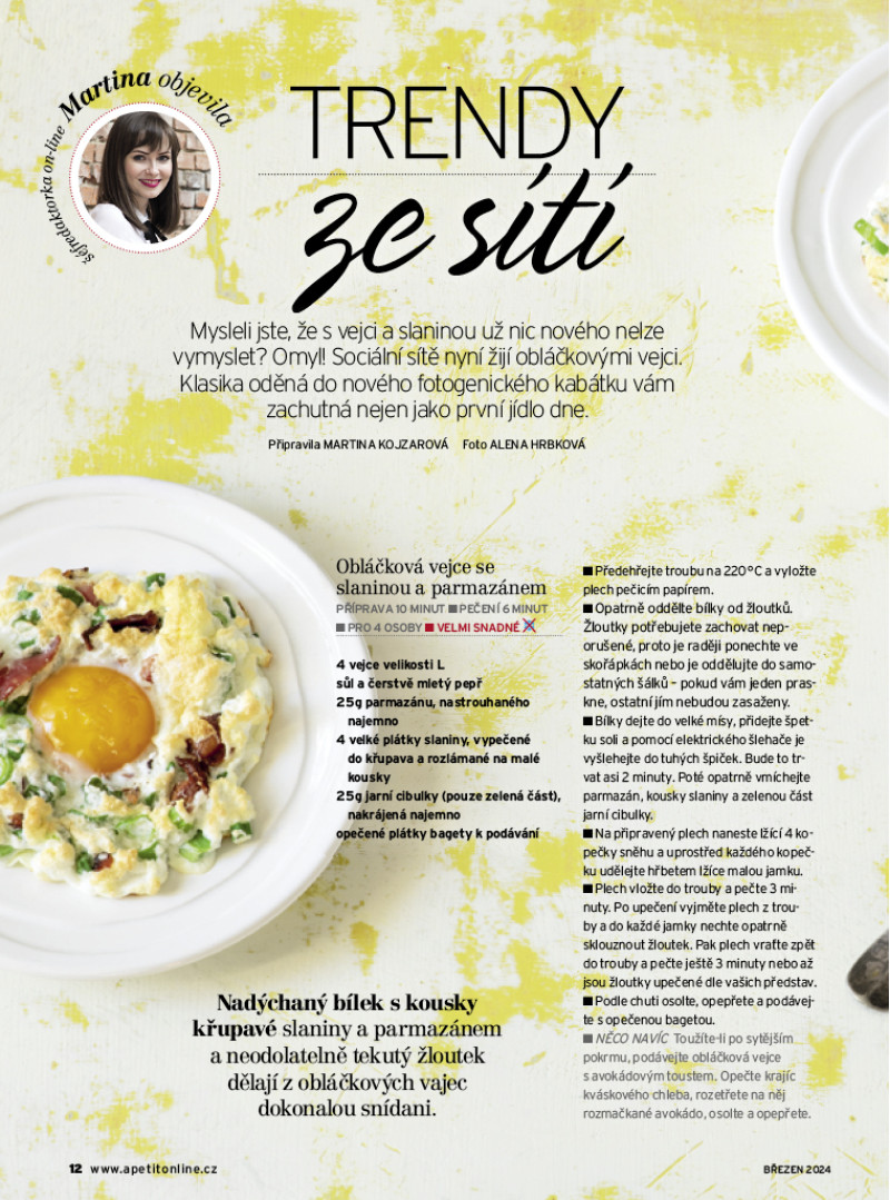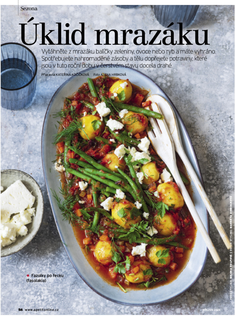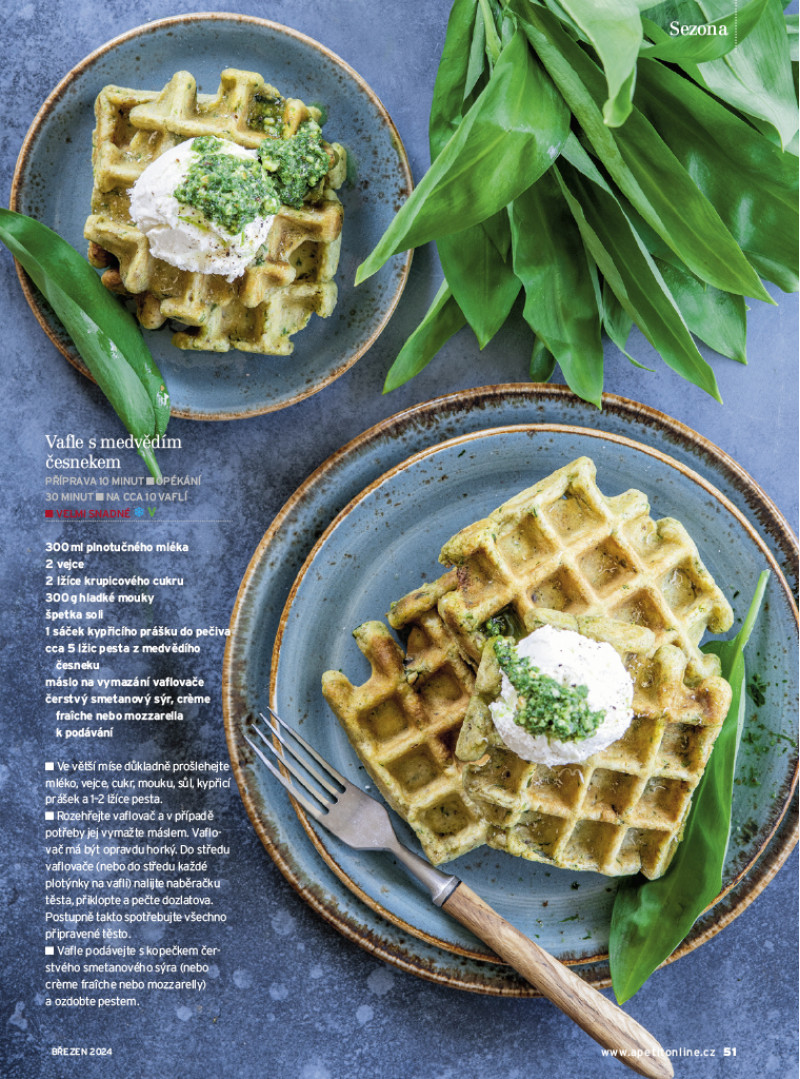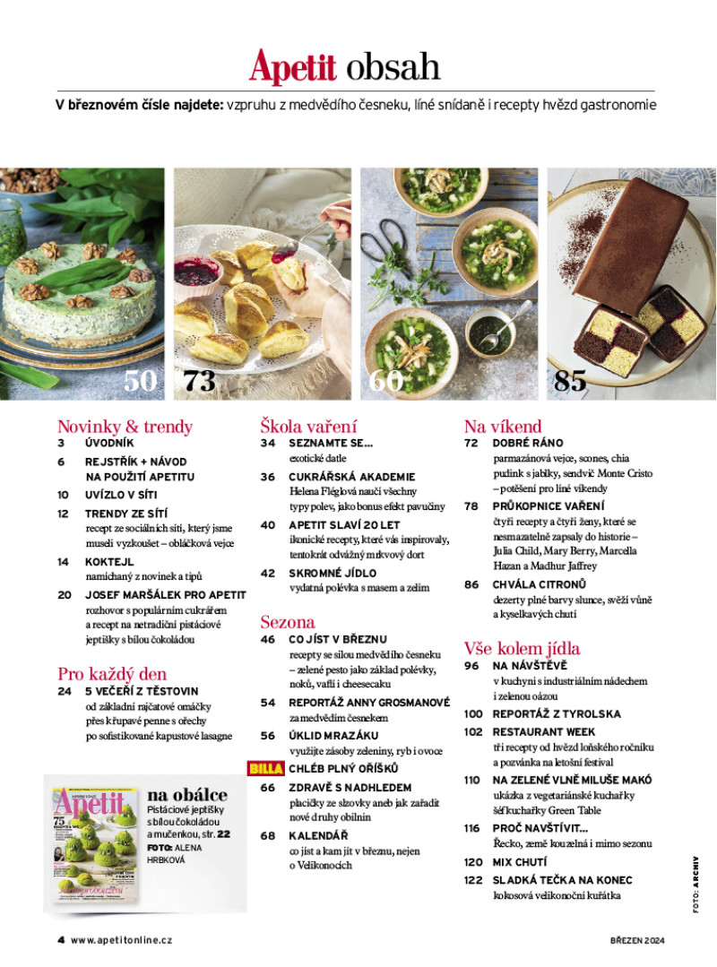 Březnové vydání Apetitu, které vychází 15. 2., vás naladí na jaro. Svěží jarní dezert pro Apetit vytvořil cukrář Josef Maršálek, který upekl religieuse (česky jeptišky) v nezvykle zelené barvě – s bílou čokoládou a pistáciemi. Březnovou surovinou číslo jedna je medvědí česnek, jedna z prvních bylinek, které se na přelomu zimy a jara objevují v přírodě. Z medvědího česneku si připravíte pesto, vafle i slaný cheesecake. Po zimě jsme naplánovali i důkladný úklid mrazáku, abyste se zbavili posledních zásob loňské zeleniny a ovoce a vytvořili si prostor pro čerstvé. A protože v březnu ještě rádi zůstaneme v teple za kamny, máme pro vás snídaně pro pomalé víkendové ráno. Svátek žen slavíme pohledem do historie. Sepsali jsme pro vás příběhy čtyř žen, které zanechaly výraznou stopu ve světové gastronomii. Představíme vám Julia Child, Marcella Hazan, Mary Berry, Madhur Jaffrey a od každé přidáme i jeden recept. Lehkost březnovému číslo dodají citronové dezerty a také bezmasá jarní jídla od propagátorky vegetariánské kuchyně Miluše Makó, jejíž novou knihu vám představíme.