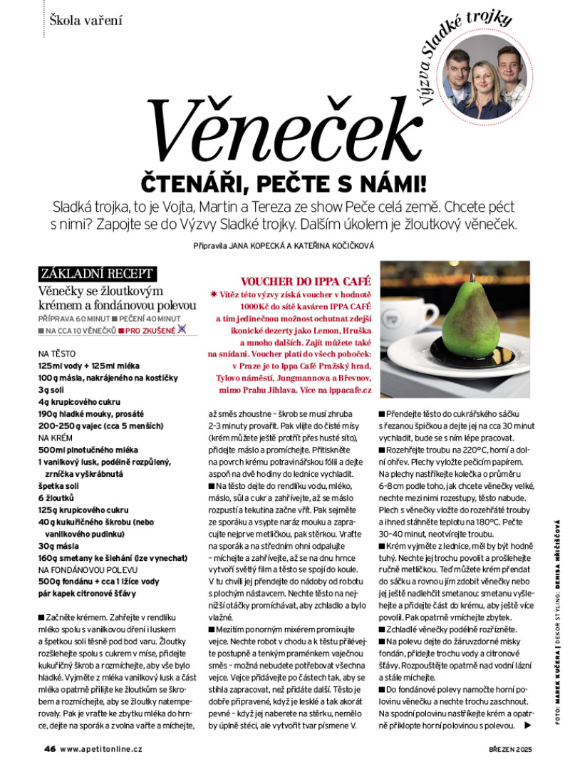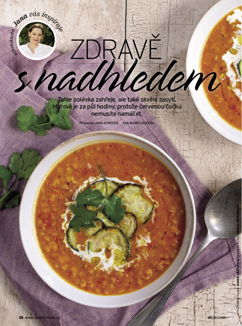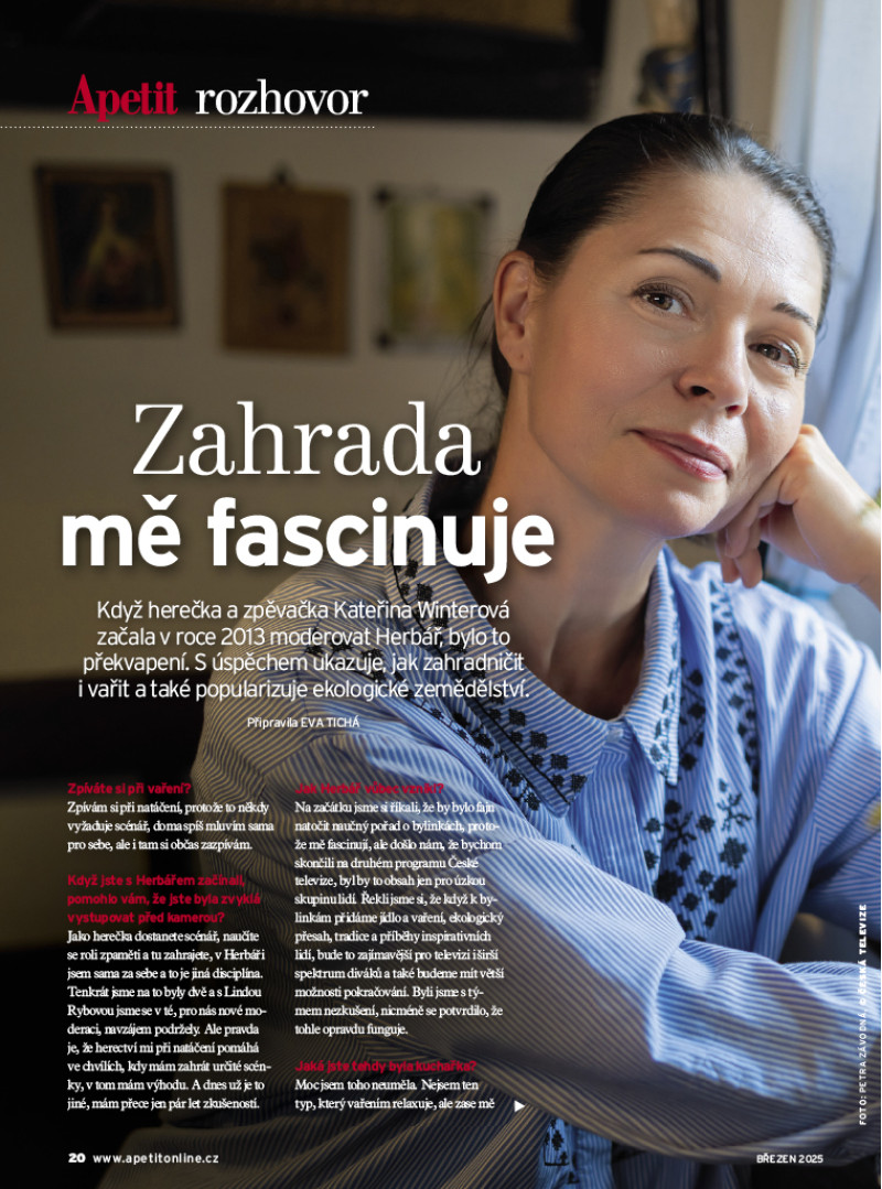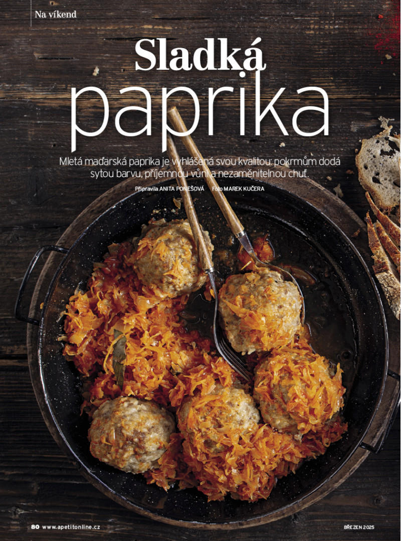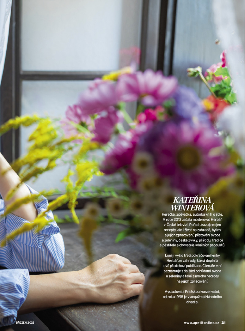 Březnové číslo Apetitu, které vychází ve čtvrtek 20. února, je předzvěstí blížícího se jara a tomu odpovídají i recepty. Po masitém únoru přichází odlehčení, vařit budeme z kadeřávku, růžičkové kapusty, špenátu, máty, ale také čekanky nebo grapefruitu. Máme pro vás návod, jak připravovat pokrmy bez masa a bezmasé jídlo dokonale ochutit. Naučíme vás vařit s tofu a přineseme inspiraci na jeho méně obvyklé úpravy, např. čokoládovou pěnu s karamelem. Aby ani v tento měsíc nepřišli zkrátka milovníci masa, vypravili jsme se do Maďarska, kde roste ta nejlepší červená paprika, a z té pro vás uvařili masové koule v kysaném zelí, pastorčinu tarhoňu s klobásou a paprikáš s haluškami. Nebudete vědět, co si dát dříve! Se sladkou tečkou tentokrát neztratíte mnoho času – vsadili jsme na bleskové dezerty, v nichž upotřebíte zásoby z mrazáku a spíže. Na cesty jsme se vypravili na japonský ostrov Hokkaidó, kde ochutnáte mořské plody a najdete farmy se skvělými mléčnými výrobky. V rozhovoru měsíce jsme si popovídali s moderátorkou Herbáře Kateřinou Winterovou, která povyprávěla o tom, co sama pěstuje na zahradě, co ji na zahradničení nejvíce baví a jakou kuchyni má nejraději.