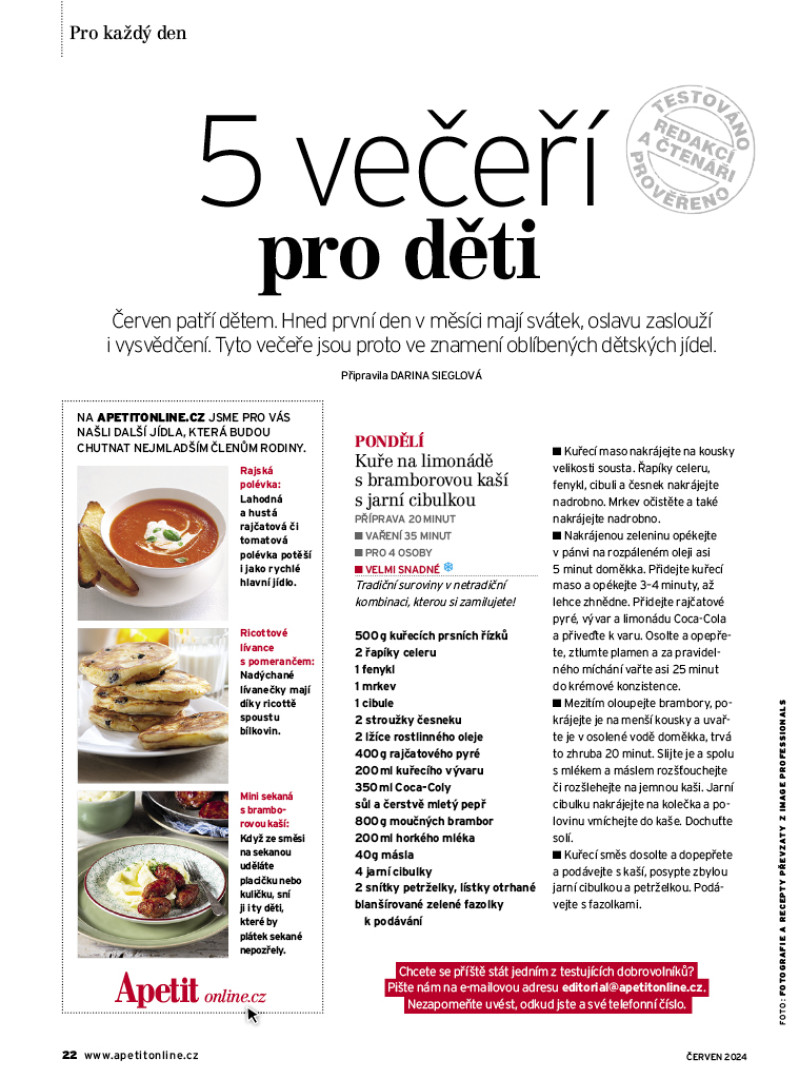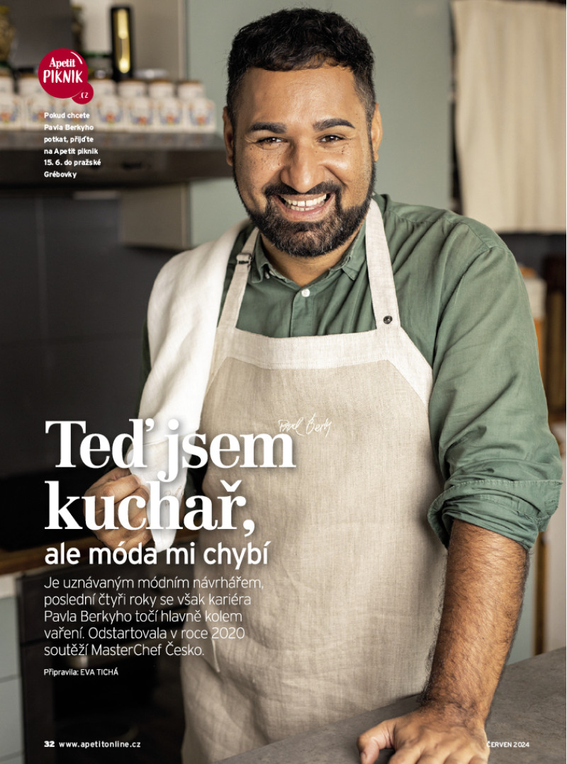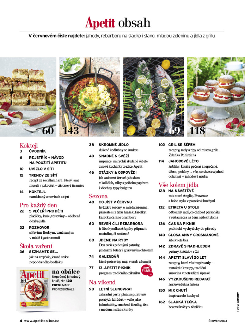 Červnové vydání Apetitu, které vychází 23. května, přináší pozvánku na letní Apetit piknik. Ten se uskuteční 15. června v pražské Grébovce a v novém Apetitu najdete seznam všech prodejců i hvězdných hostů, kteří se objeví na hlavním pódiu. Vystoupí i Pavel Berky, se kterým najdete v novém čísle rozhovor, kde vypráví o tom, jak zkouší nová jídla a co nejraději vaří sám sobě. Do přírody se vydáme nejen během našeho pikniku. V červnu se s námi můžete vypravit na ryby, které si hned na břehu připravíme na roštu. Budeme také grilovat, tentokrát podle receptů šéfkuchaře Zdeňka Pohlreicha, a nabízíme i inspiraci na zahradní party během nejteplejších nocí v roce. Nad dezertem nemusíte moc přemýšlet. Červen je měsícem jahod a naše koblihy plněné jahodami nebo křupavý jahodovo-bezový dort jsou prostě neodolatelné! A kdyby vás toto ovoce přece jen neoslovilo, zkuste nasladko připravit rebarboru.