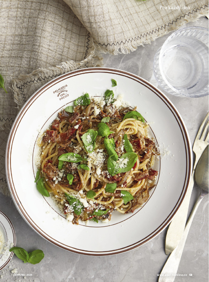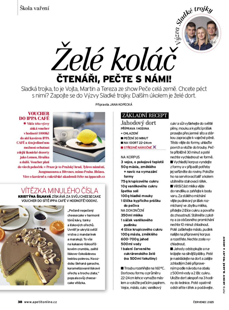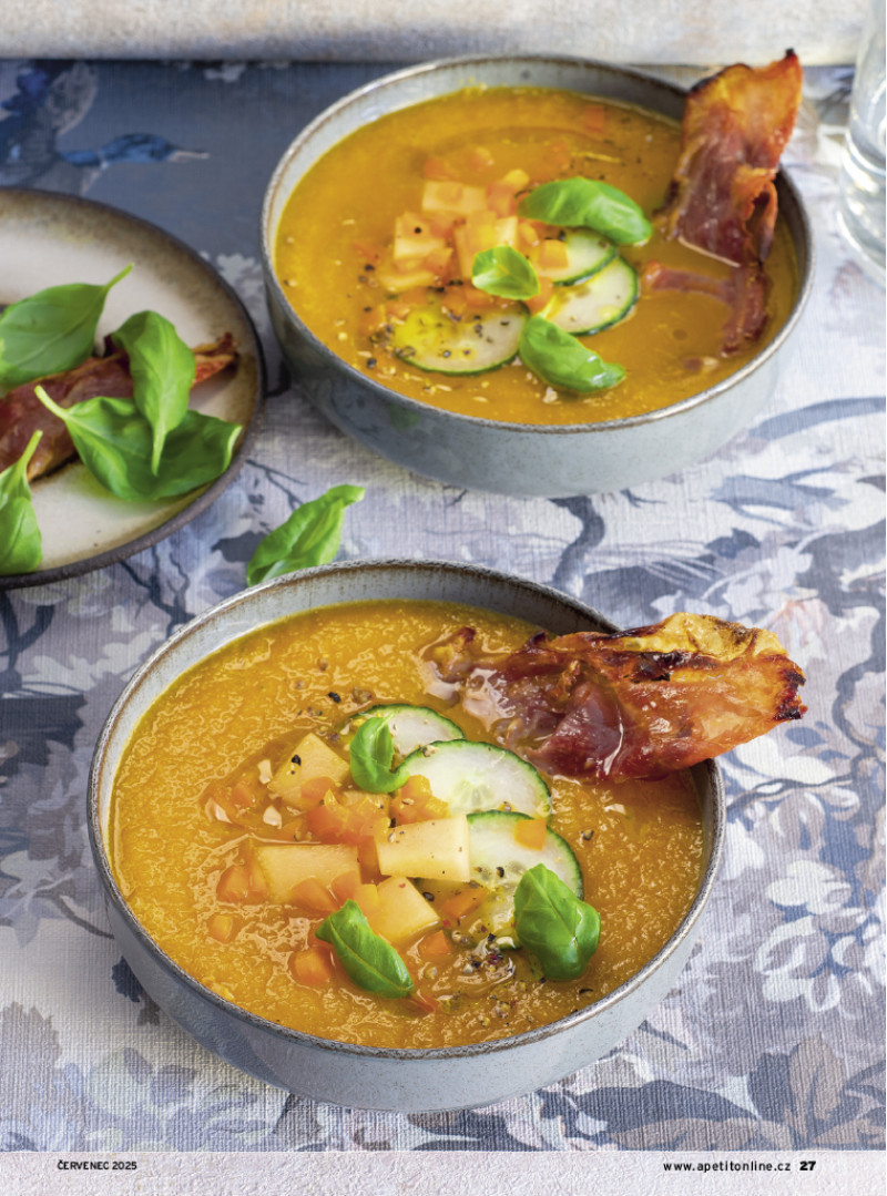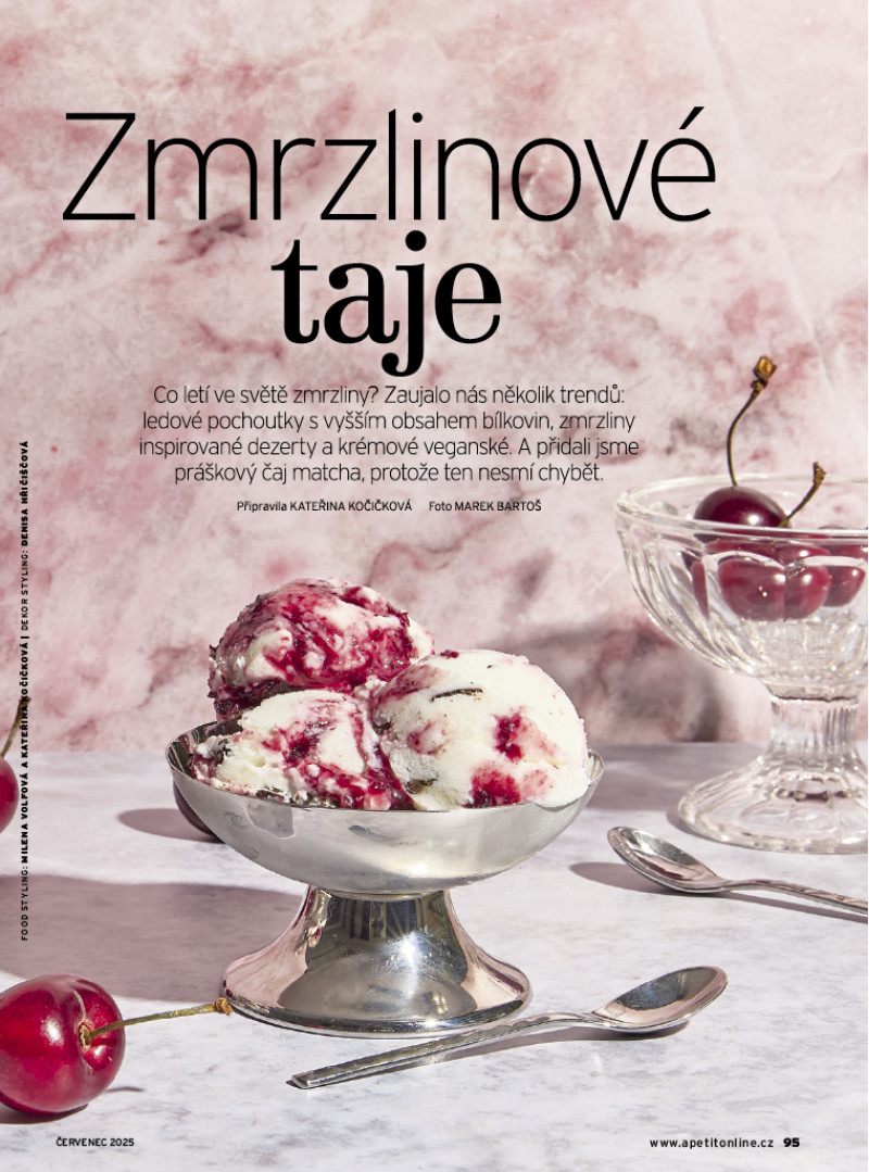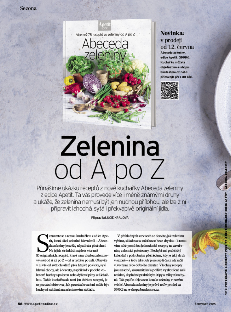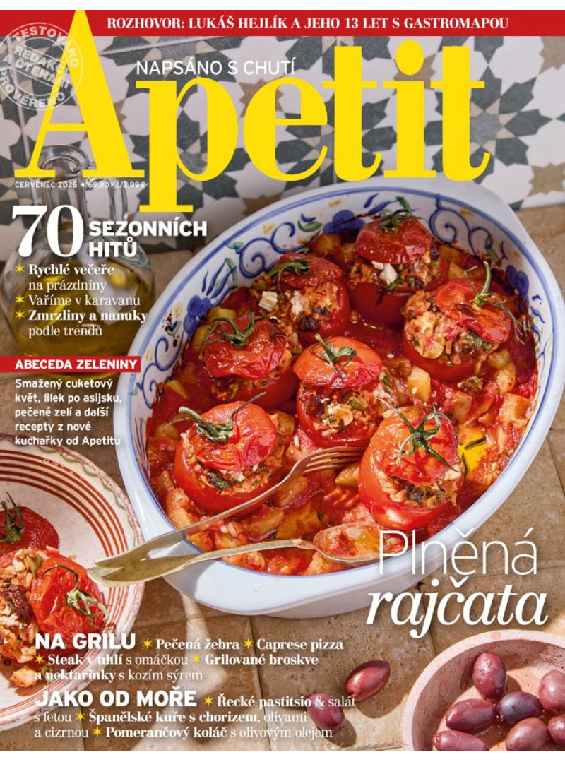 Červencové číslo Apetitu je plné slunce, čerstvé zeleniny, středomořských chutí a letního osvěžení v podobě zmrzliny. Těšit se můžete na recepty z naší nové kuchařky Abeceda zeleniny: pečené zelí s fazolemi, lilek po asijsku, smažené cuketové květy nebo indický palak paneer. Na grilu si upečeme šťavnatá žebra, steaky, kuřecí špízy, pizzu Caprese i sladkou tečku v podobě grilovaných broskví. Středomořská kuchyně nás okouzlila svou jednoduchostí a chutěmi – podáváme rybí polévku, plněná rajčata, pasticio se salátem, kuře s chorizem a olivami a pomerančový koláč. A pokud se chystáte na dovolenou karavanem, máme pro vás celodenní inspiraci od ovesné kaše k snídani přes cestovatelský dal až po čerstvě ulovené rybu k večeři. Sladkou kapitolou je domácí zmrzlina. Letos jsou trendy nové příchutě i zdravější varianty – vyzkoušejte matcha zmrzlinu, proteinovou s mangem, veganské nanuky nebo poctivou verzi dortu Černý les ve zmrzlinové podobě. V rozhovoru měsíce jsme vyzpovídali Lukáše Hejlíka, autora populární Gastromapy. Jak pozná dobrou restauraci? A co hledá kromě skvělého jídla? Pozveme vás také na méně známá, přitom kouzelná místa na jižní Moravě, a přinášíme ukázku z Židovské kuchařky, která zaujme příběhem i recepty.