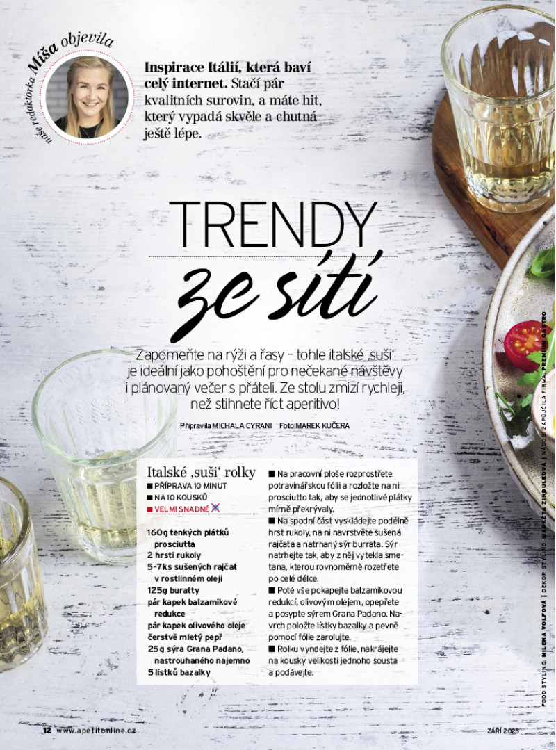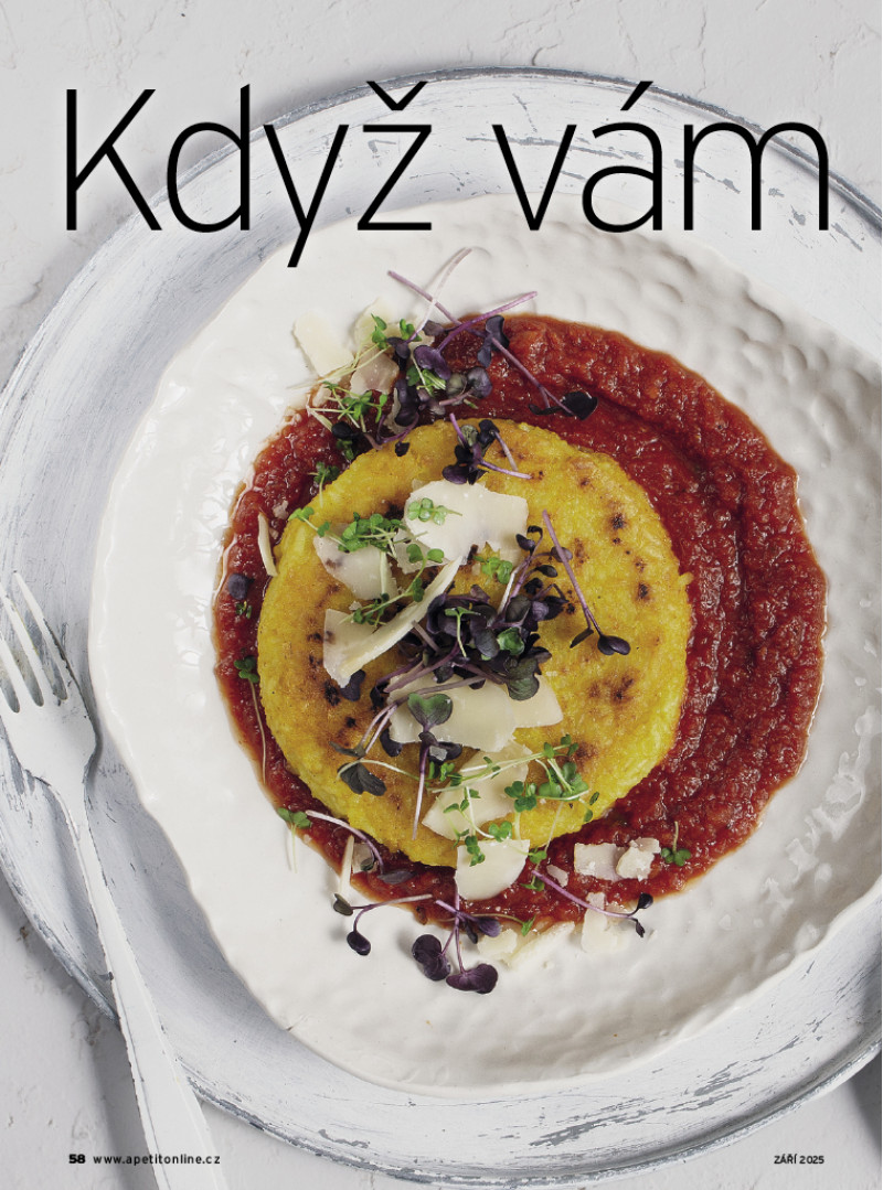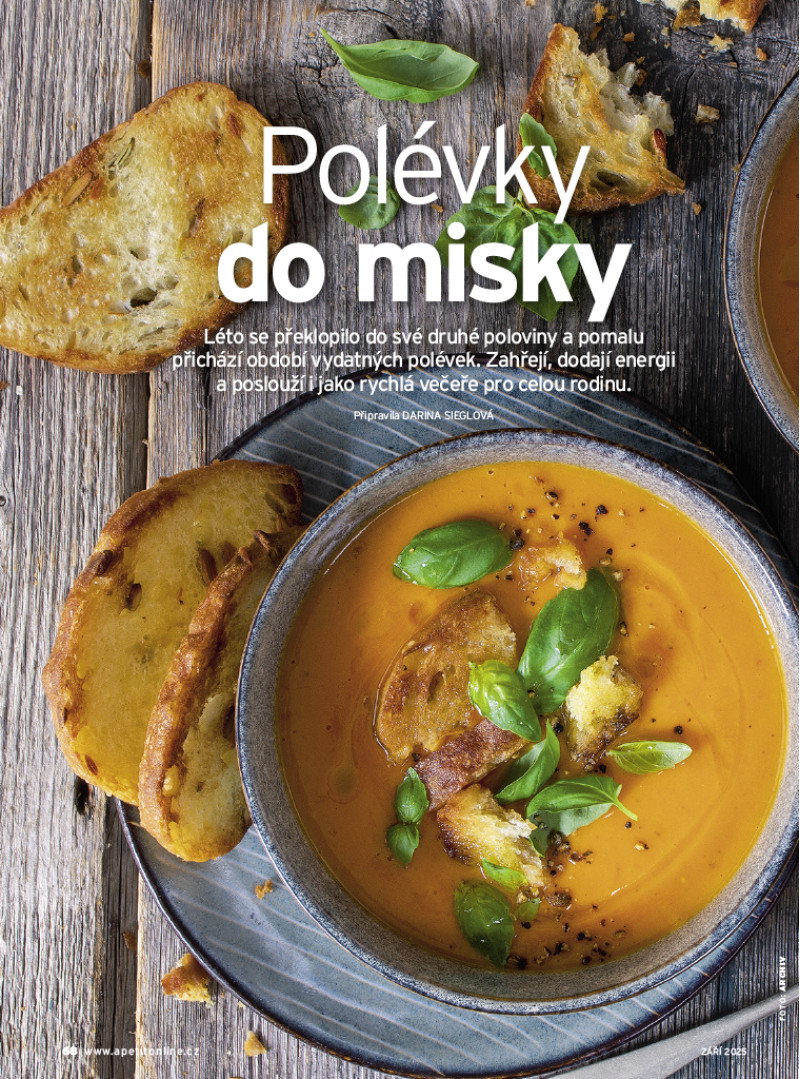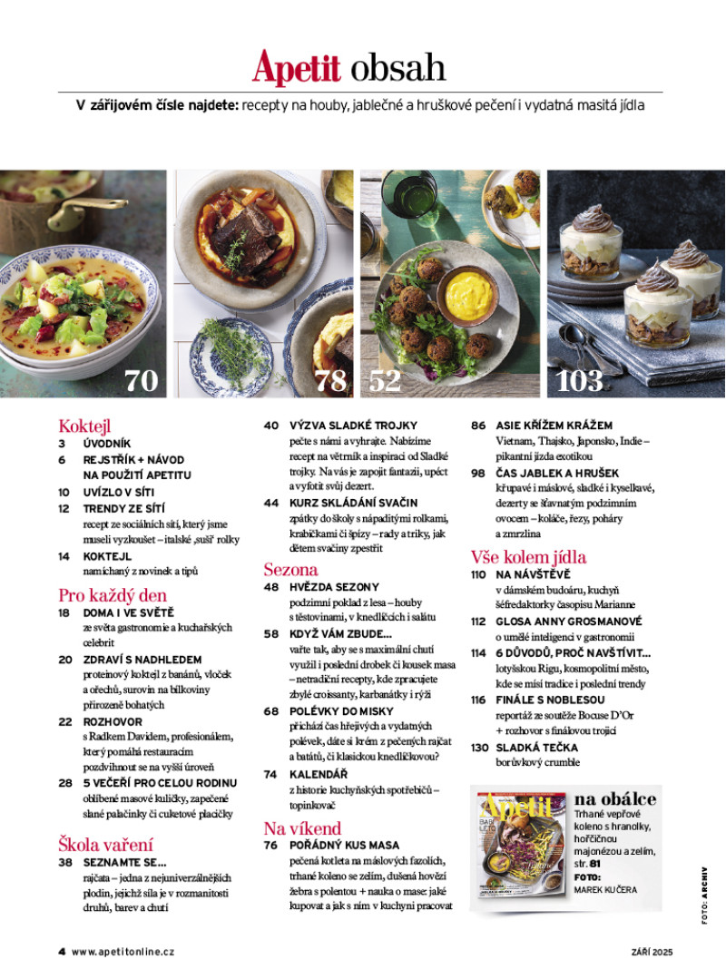 Zářijové číslo Apetitu přináší rychlé recepty do hektického měsíce. Poradíme vám, jak obměnit školní svačiny, a zaměřili jsme se i na vaření beze zbytků – naučíme vás, jak proměnit staré croissanty ve vafle, rizoto v křupavé placičky nebo sekanou v chutné rolky. Zpracujeme s vámi zářijovou úrodu: jablka, hrušky i houby. Připravili jsme recepty na kuře z jedné pánve s houbami, houbové ragú s polentou, těstoviny s houbovou omáčkou, jablečný koláč i hruškovou zmrzlinu se sušenkami. Masožravci se mohou těšit na dušená hovězí žebra, picanhu jako rostbíf či trhané vepřové koleno. Ve Sladké trojce vás finalisté soutěže Peče celá země vyzvou k upečení větrníku – a soutěží se o voucher do kaváren IPPA Café. Inspiraci najdete i v naší cestě Asií – od japonského ramenu přes vietnamskou bagetu až po thajské Pad thai. Rozhovor měsíce patří šéfkuchaři Radku Davidovi, který otevřeně mluví o tvrdé realitě gastronomie, o práci šestnáct hodin denně i o tom, jak se proměnilo vedení kuchyní.
