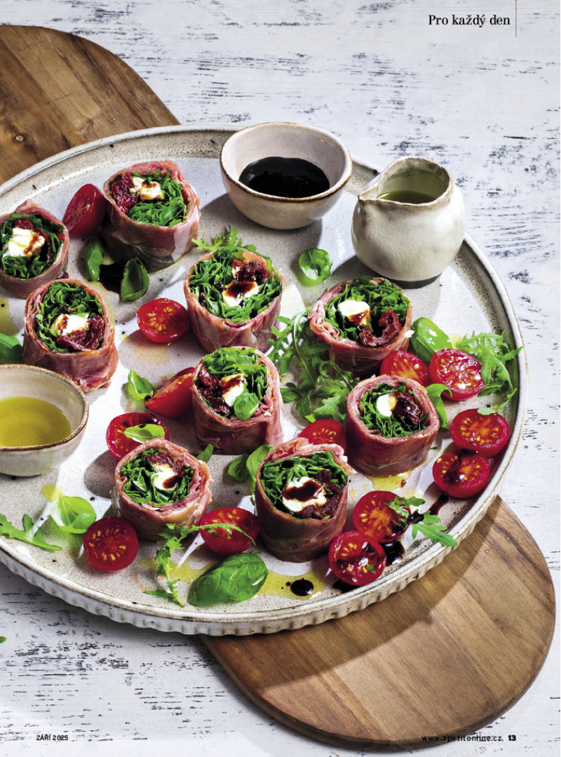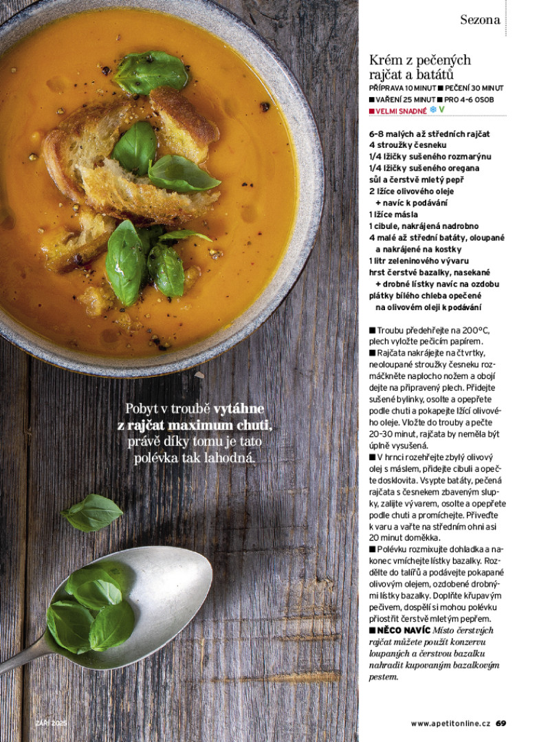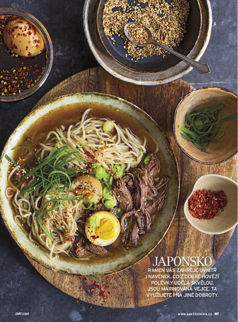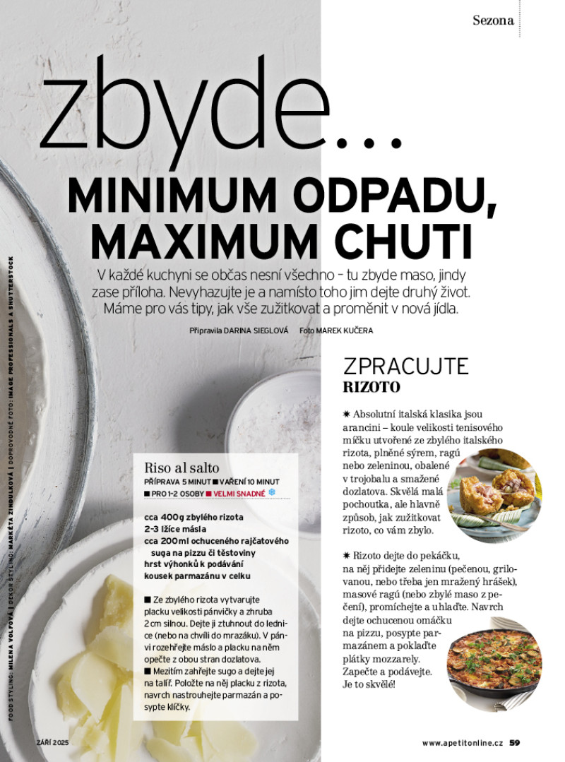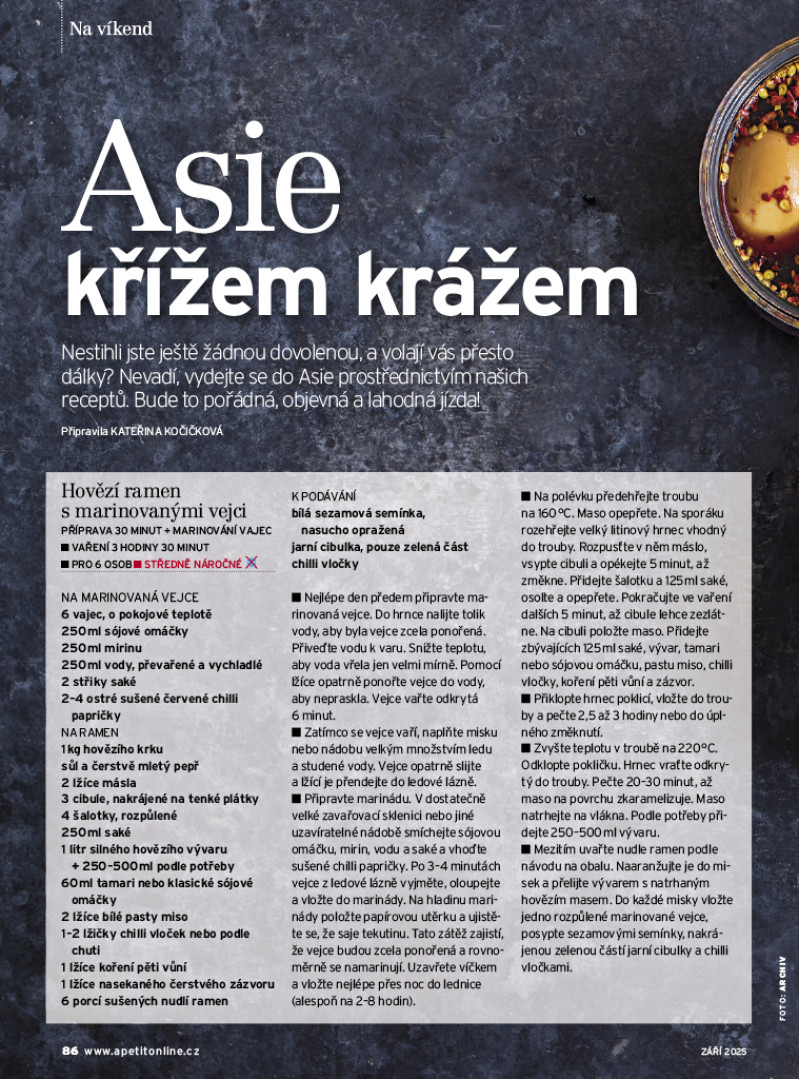 Zářijové číslo Apetitu přináší rychlé recepty do hektického měsíce. Poradíme vám, jak obměnit školní svačiny, a zaměřili jsme se i na vaření beze zbytků – naučíme vás, jak proměnit staré croissanty ve vafle, rizoto v křupavé placičky nebo sekanou v chutné rolky. Zpracujeme s vámi zářijovou úrodu: jablka, hrušky i houby. Připravili jsme recepty na kuře z jedné pánve s houbami, houbové ragú s polentou, těstoviny s houbovou omáčkou, jablečný koláč i hruškovou zmrzlinu se sušenkami. Masožravci se mohou těšit na dušená hovězí žebra, picanhu jako rostbíf či trhané vepřové koleno. Ve Sladké trojce vás finalisté soutěže Peče celá země vyzvou k upečení větrníku – a soutěží se o voucher do kaváren IPPA Café. Inspiraci najdete i v naší cestě Asií – od japonského ramenu přes vietnamskou bagetu až po thajské Pad thai. Rozhovor měsíce patří šéfkuchaři Radku Davidovi, který otevřeně mluví o tvrdé realitě gastronomie, o práci šestnáct hodin denně i o tom, jak se proměnilo vedení kuchyní.