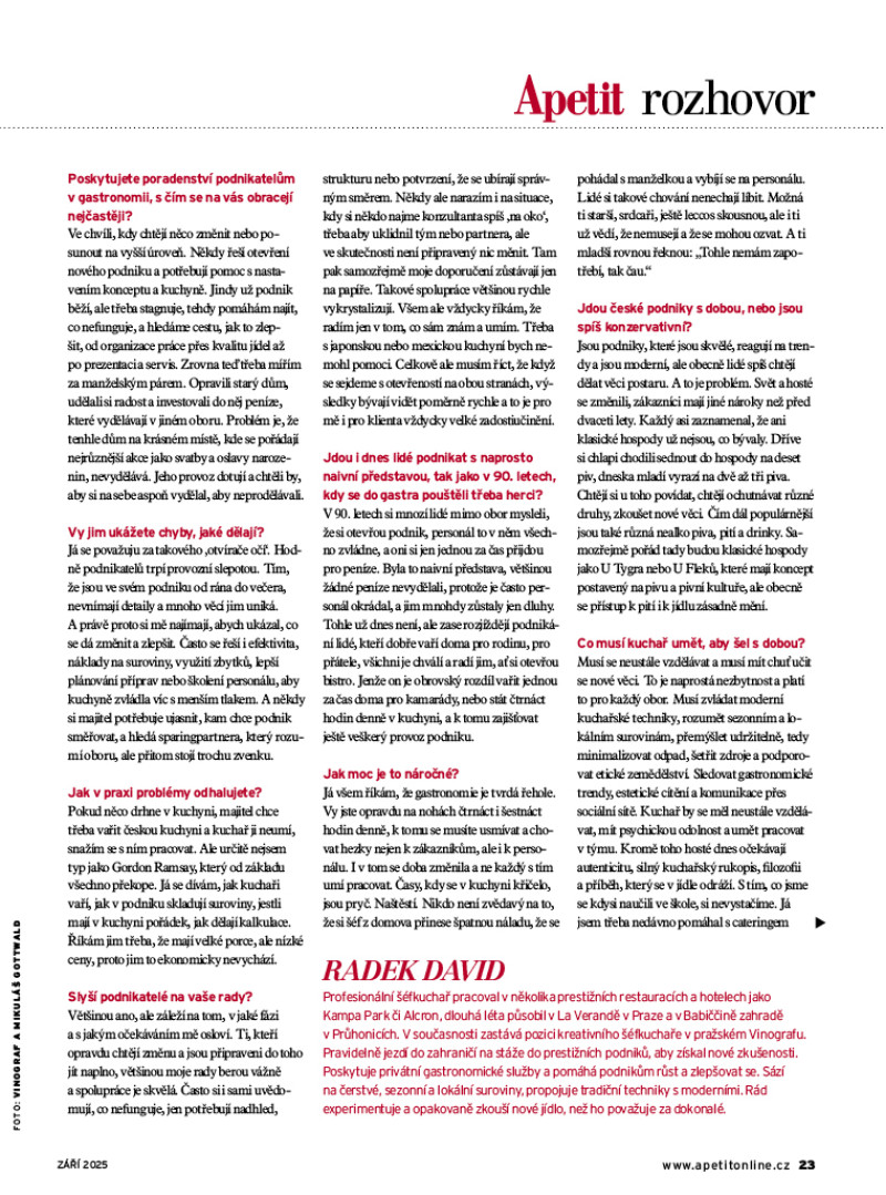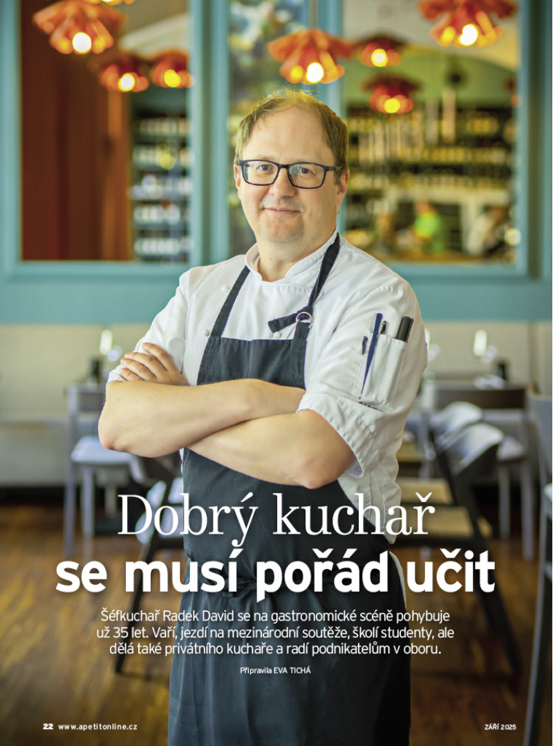 Rozhovor měsíce patří šéfkuchaři Radku Davidovi, který otevřeně mluví o tvrdé realitě gastronomie, o práci šestnáct hodin denně i o tom, jak se proměnilo vedení kuchyní.