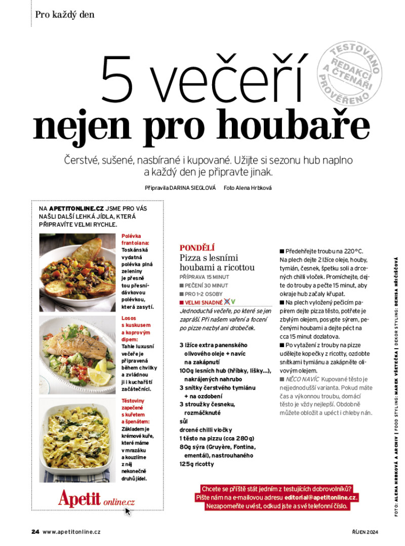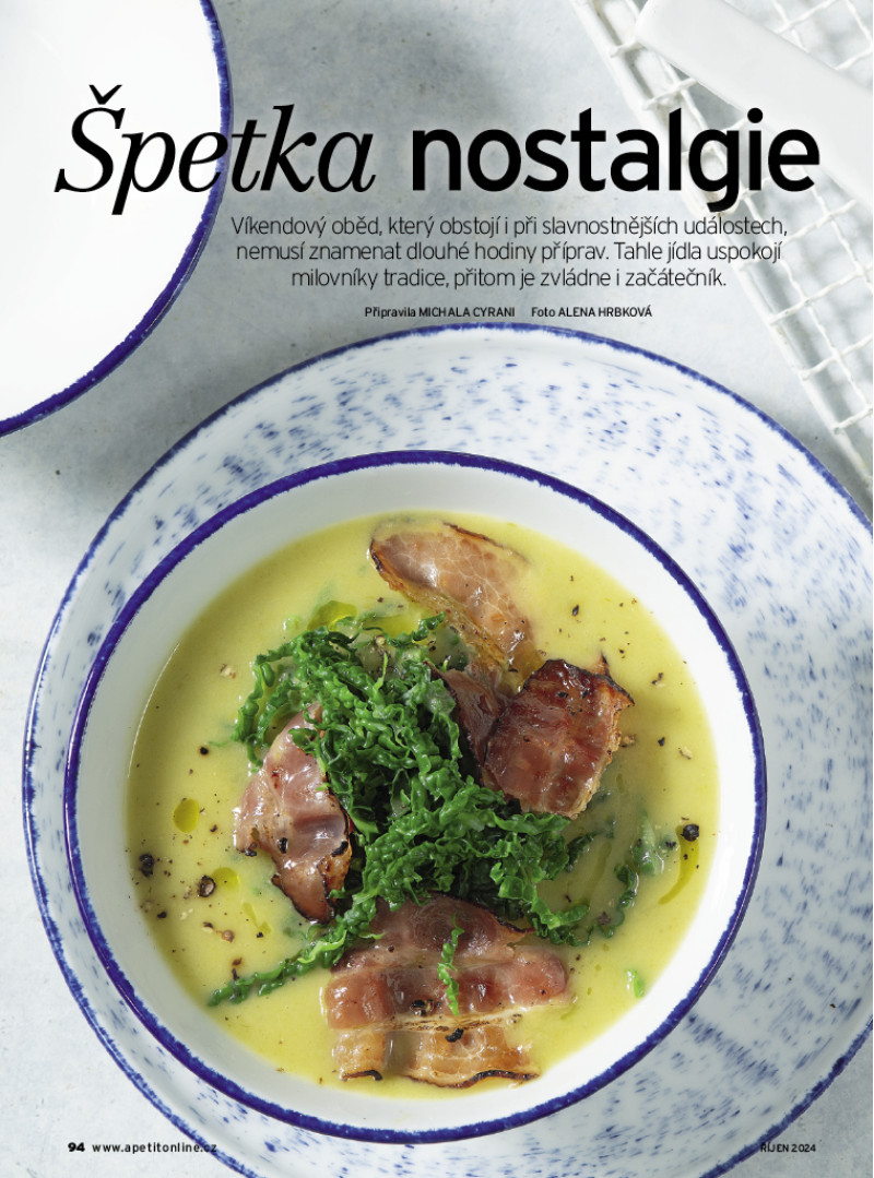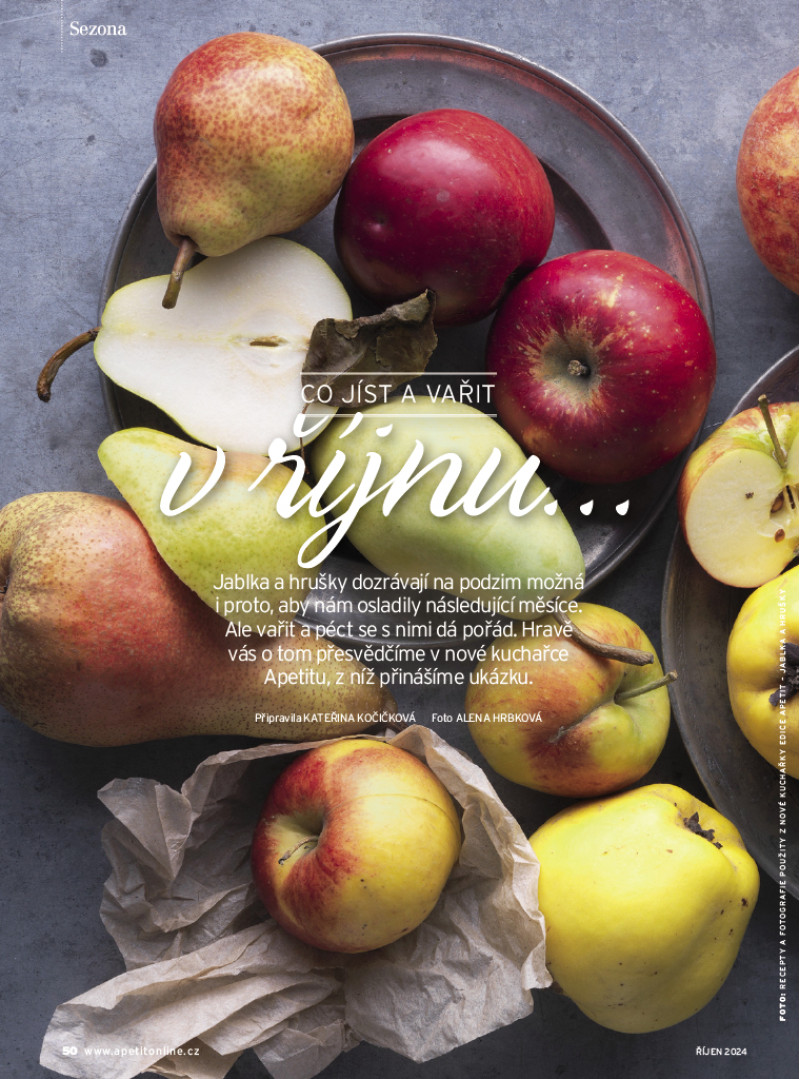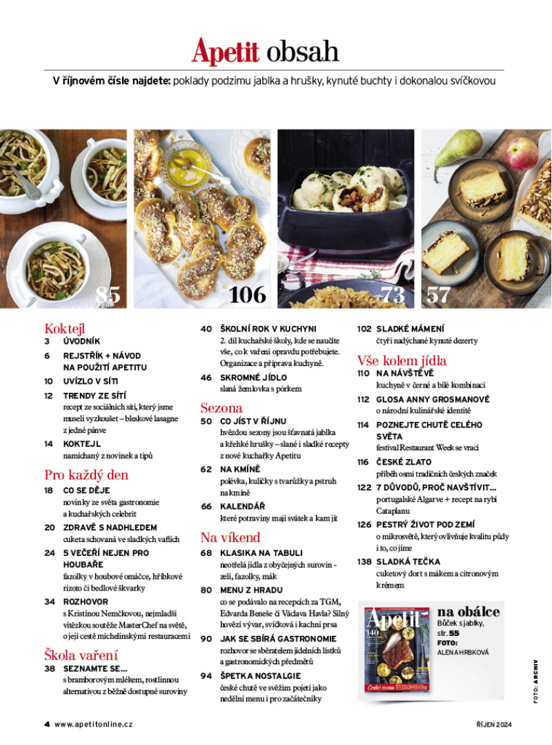 Říjnové číslo Apetitu je inspirované českou kuchyní. Mísí se v něm tradiční recepty s těmi moderními – třeba kuřetem na čerstvé paprice nebo perníkem s žitným kvasem. Také jsme zjišťovali, jak se vařilo a vaří na Hradě za prezidentů Masaryka, Beneše, Havla i Pavla: získáte recepty na candáta s holandskou omáčkou, svíčkovou s Pálffyho knedlíkem nebo kachní prsa se sečuánským pepřem. Sladké moučníky jsme pekli z kynutého těsta: motali jsme rohlíčky plněné lískooříškovým krémem a mučedníky s oříškovou náplní a pekli koláč s karamelem a vdolky s povidly. V Apetitu najdete také ukázku z naší nové kuchařky Jablka a hrušky, připravili jsme pro vás neviditelný koláč s jablky a hruškami, jablečný karamelový džem, žemlovku nebo bůček pečený s jablky. V rozhovoru jsme si povídali s Kristínou Nemčkovou, kterou si možná pamatujete jako nejmladší vítězku soutěže MasterChef Česko. Kristína se po soutěži vydala do světa studovat a sbírat zkušenosti a nyní popisuje zážitky z michelinských restaurací, v nichž pracovala, a také svá očekávání z nové práce – na podzim se přesune na Filipíny. V novém seriálu Školní rok v kuchyni se věnujeme organizaci v kuchyni i přímo při vaření. A protože říjnové číslo je ryze české, podívali jsme se na unikátní české značky a přinášíme příběhy těch nejslavnějších. V neposlední řadě jsme prozkoumali život pod zemí v Česku, který ovlivňuje, co se ocitne na našem talíři.
