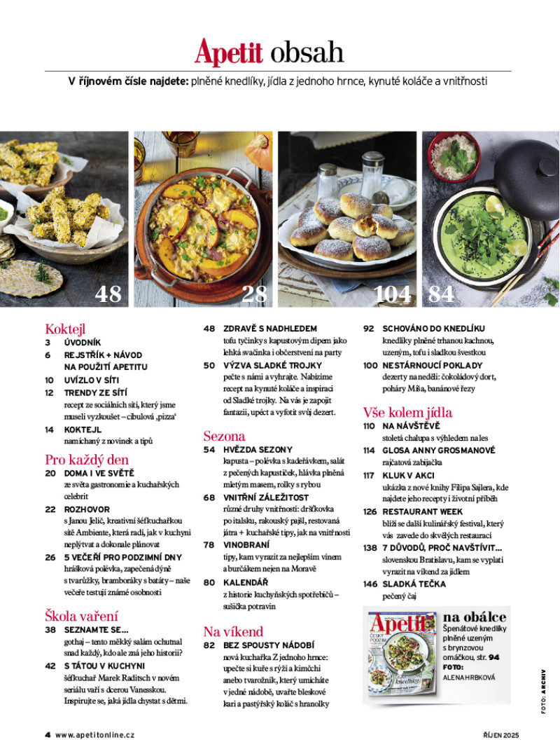 Říjnový Apetit je tady! Je tradičně převážně český a plný receptů, které v podzimních dnech zahřejí i potěší – od plněných knedlíků přes jídla z jednoho hrnce až po voňavé kynuté buchty a čokoládový dort.