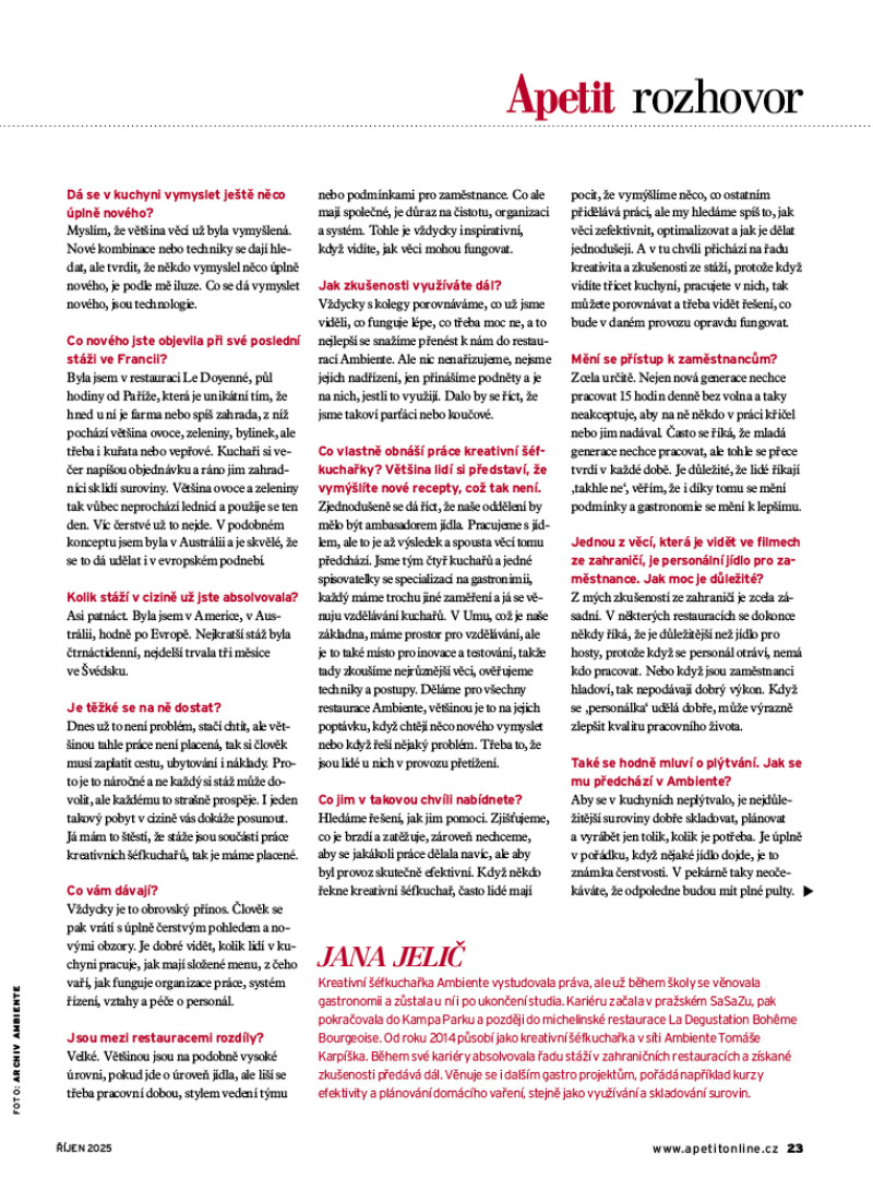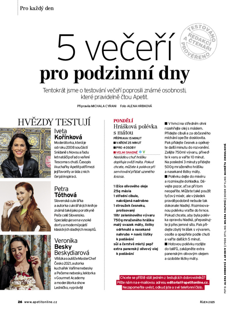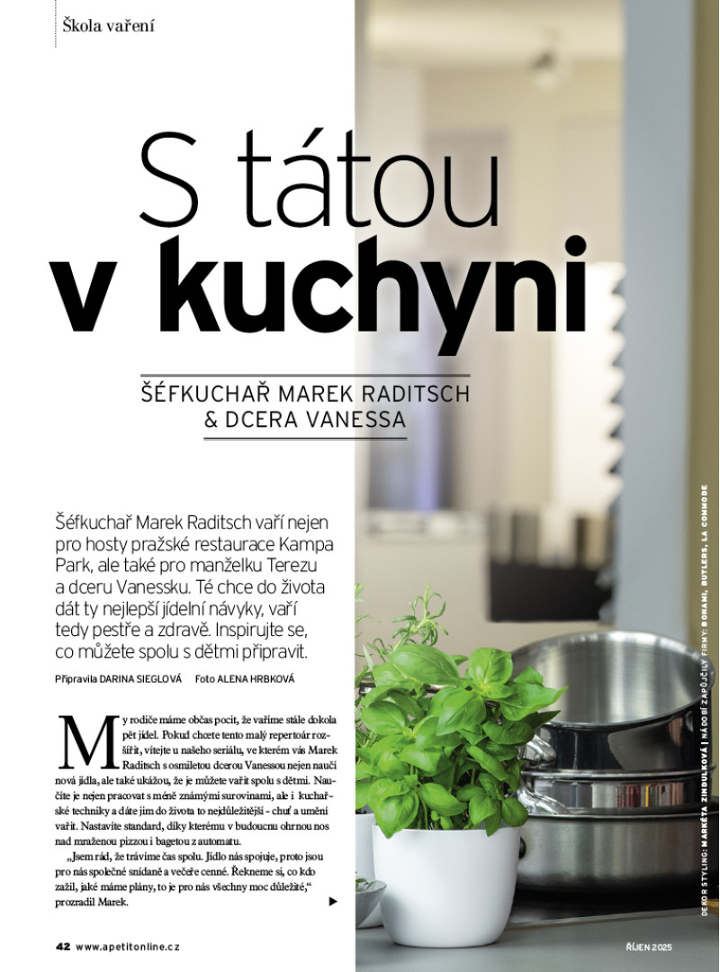Říjnový Apetit je tady! Je tradičně převážně český a plný receptů, které v podzimních dnech zahřejí i potěší – od plněných knedlíků přes jídla z jednoho hrnce až po voňavé kynuté buchty a čokoládový dort. Nově se můžete těšit i na seriál S tátou v kuchyni: šéfkuchař Marek Raditsch a jeho dcera Vanesska vám ukážou, jak vařit s dětmi tak, aby je to bavilo i chutnalo – začínáme receptem na arancini z rizota. Co najdete v říjnovém Apetitu? Vnitřnosti v moderním pojetí: dršťkovou polévku po italsku, pajšl, pikantní ledvinky i játra se sečuánským pepřem Jídla z jednoho hrnce: pastýřský koláč se zapečenými hranolky, zelené kari nebo kuře s kimčchi Plněné knedlíky: do kynutých jsme schovali trhanou kachnu, do špenátových uzené maso, do bramborových tofu a cuketové zelí a do tvarohových švestky Čeká sladká klasika: Míša poháry, banánová buchta s karamelem, čokoládový dort