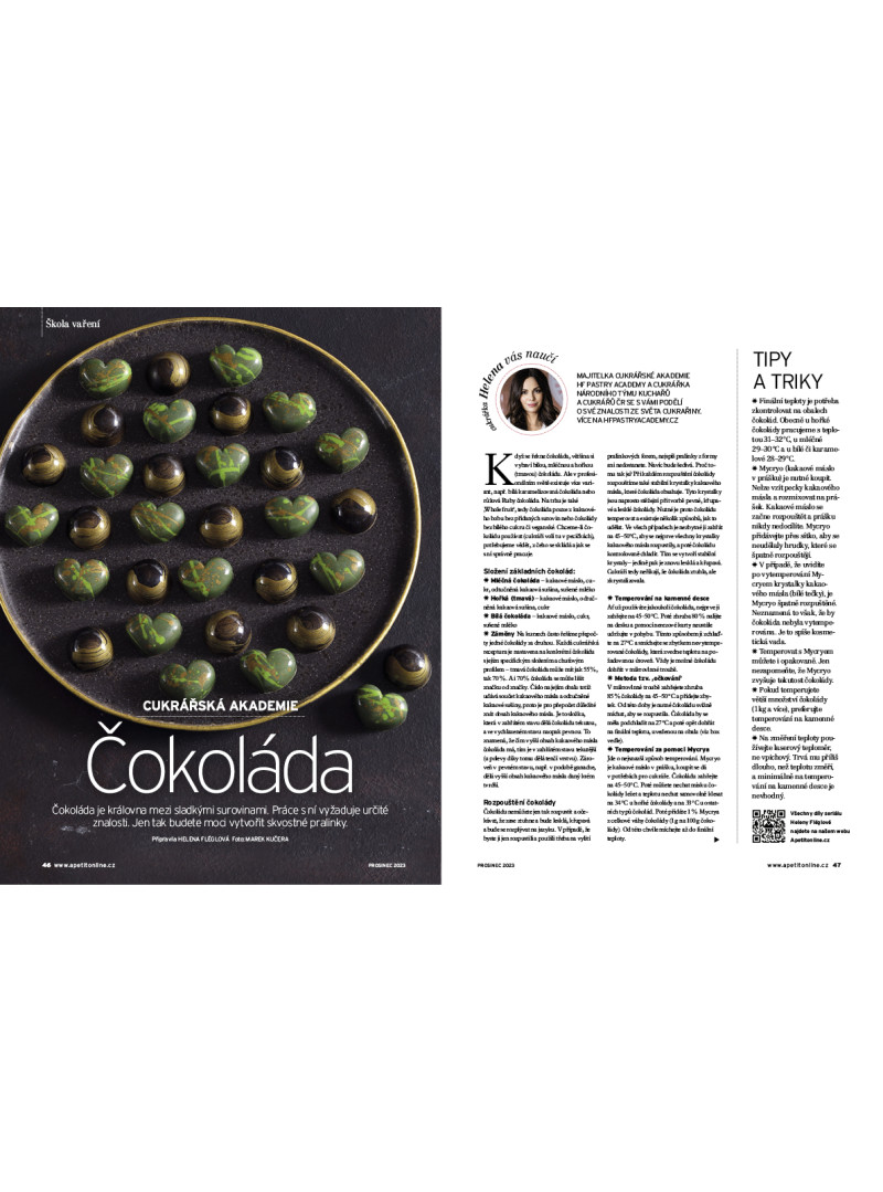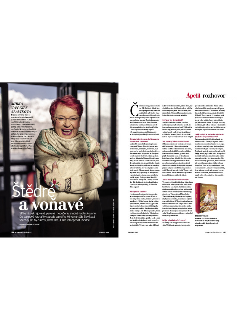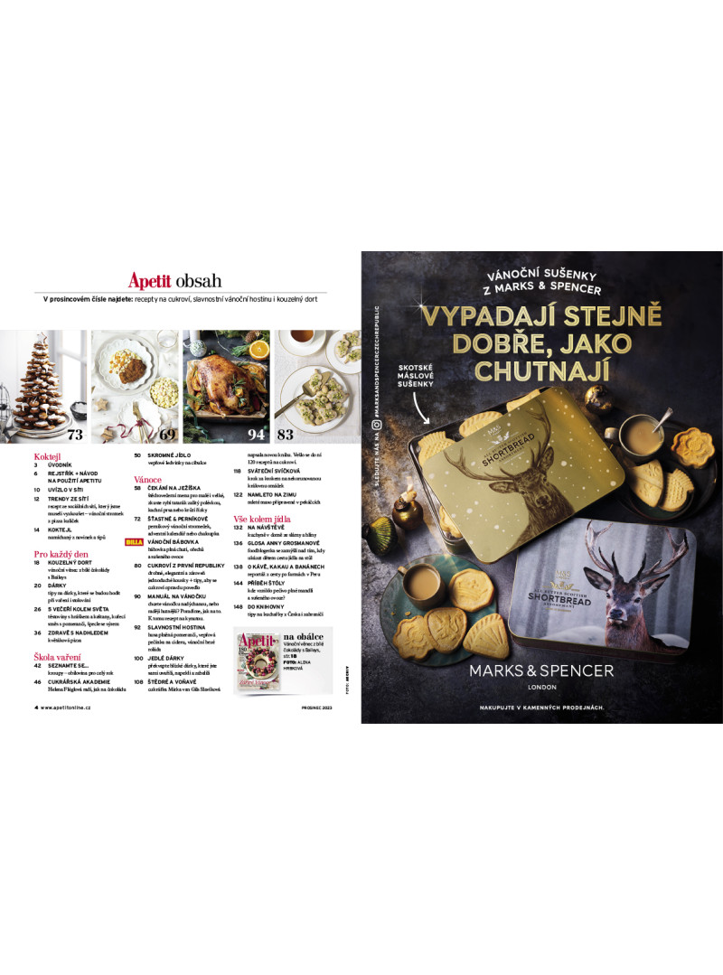 Prosincový Apetit, nejočekávanější vydání roku, vychází už 16. 11. Na jeho stránky jsme sepsali vše, co budete potřebovat k prožití těch nejkouzelnějších Vánoc. Z perníku upečeme stromeček, chaloupku i adventní kalendář. Máme pro vás spoustu tipů na dárky, včetně těch jedlých. Helena Fléglová vás například ve své Cukrářské akademii zasvětí do tajů čokolády a ukáže vám, jak na luxusní pralinky. Péct cukroví budeme hned dvakrát – nejdříve v duchu prvorepublikových tradic a elegance, podruhé pak s Mirkou van Gils Slavíkovou z její kuchařky Štědré a voňavé. Vyhneme se všem potenciálním zádrhelům a díky vánočkovému manuálu na stůl postavíme dokonalou vánočku. Stačí pár triků a štědrovečerní menu připravíme tak, aby chutnalo malým i velkým. Další sváteční dny můžete blízké pozvat na husí, vepřovou či dýňovou pečínku či na luxusní svíčkovou. Tu díky receptu krok za krokem zvládnete i v případě, že jste ji doteď odkládali. Nejen svátečními pokrmy je ovšem člověk v prosinci živ, a proto jsme sepsali i mnoho rychlých lahodných nápadů na obědy a večeře, které vás zasytí a zahřejí.