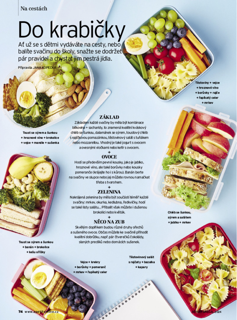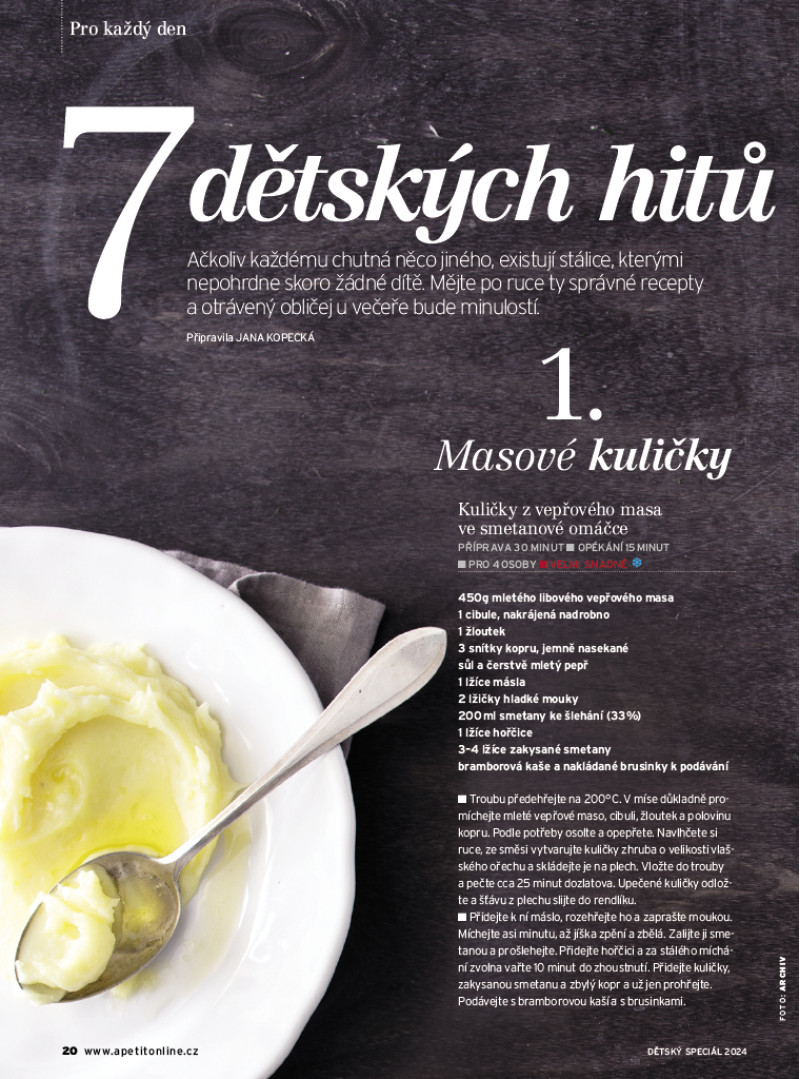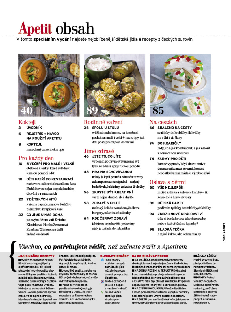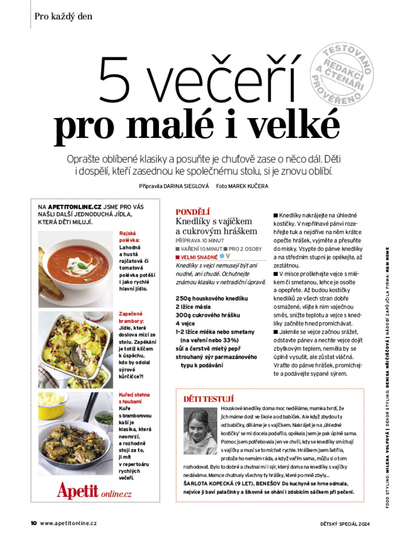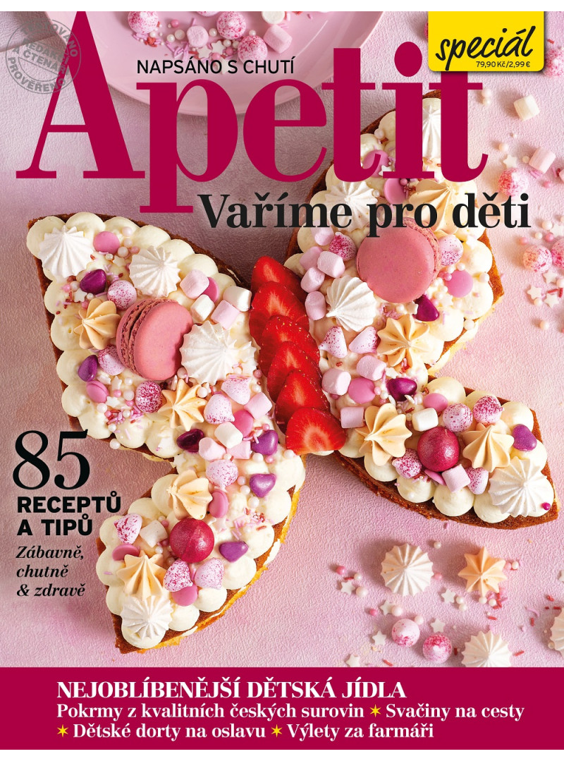 Vařit pro děti je zábava, brzy vám však může dojít inspirace, protože chtějí to samé dokola. Jak obohatit nejmladším členům rodiny jídelníček a vařit zdravě tak, aby jim chutnalo? Dětský speciál Apetitu nabízí 100 stran receptů na nejoblíbenější dětská jídla i novou inspiraci. Najdete zde 5 rychlých večeří, ale také svačiny do školy nebo na výlet. Sestavili jsme pro vás menu na rodinný oběd, aby chutnalo dětem i dospělým, a přinášíme tipy, jak celé rodině do jídla propašovat více prospěšných surovin, jako jsou luštěniny, méně oblíbené druhy zeleniny nebo bílkoviny. Budeme také slavit a vymysleli jsme tři narozeninové dorty, které připravíte z dostupných surovin a jejichž zdobení je sice nápadité, ale zvládne ho každý. K tomu přidáváme tipy na občerstvení na party. Ve speciálu dále najdete rozhovor s expertkou na etiketu Iva Pluháčkovou, která říká, že děti patří do restaurací a měly by se odmalička učit, jak se chovat u stolu. A přinášíme také inspiraci, kam s dětmi vyrazit na farmy, kde nabízejí skvělé produkty i možnost strávit čas mezi zvířaty. Všechna jídla do dětského speciálu jsme otestovali v redakční kuchyni a uvařili jsme je z kvalitních českých surovin. Dostanete od nás i tipy na lokální produkty a výrobce.