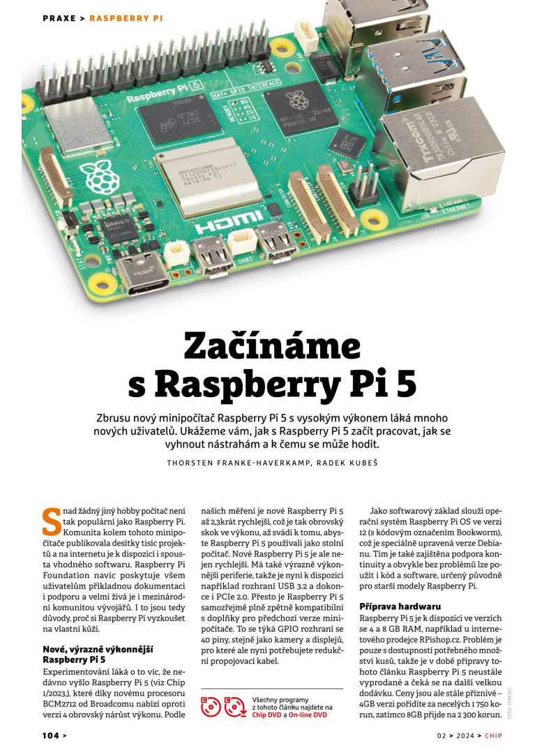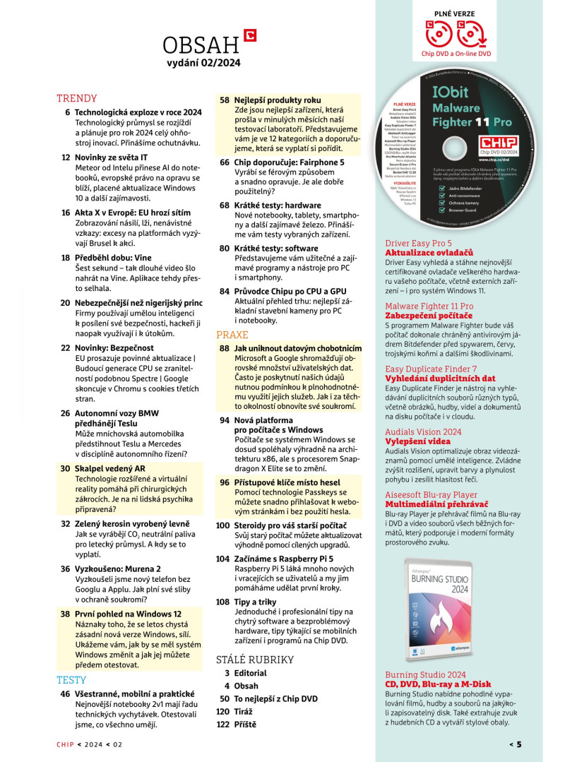 V únorovém Chipu na vás čeká velký průvodce hardwarovými nákupy. V souhrnných tabulkách vám ukážeme nejlepší zařízení, která v minulých měsících prošla naší testovací laboratoří. Představíme vám je ve 14 kategoriích a doporučíme, která se opravdu vyplatí pořídit. Jak uniknout datovým chobotnicím? Microsoft a Google shromažďují obrovské množství uživatelských dat. Často je poskytnutí našich údajů nutnou podmínkou k plnohodnotnému využití jejich služeb. Poradíme vám, jak i za těchto okolností obnovíte své soukromí. Dočtete se také o nové technologii Passkeys, která by mohla nahradit nenáviděná a stále zapomínaná hesla. Poradíme, jak pomocí cílených upgradů oživit svůj starší PC a představíme první kroky s mikropočítačem Raspberry Pi 5, se kterým za málo peněz zvládnete překvapivě hodně úkolů. Na Chip DVD na vás čeká editor Audials Vision využívající k úpravám videí prvky umělé inteligence. Na základě znalostního modelu dokáže skvěle vylepšovat obraz videa a zvuk, čehož by klasickými matematickými modely nedosáhl. Praktickou úsporu místa nabídne Easy Duplicate Finder, který najde a vymaže duplicitní fotografie a dokumenty. Zabezpečení počítače zvýší aktualizované ovladače s pomocí aplikace Driver Easy a komplexní antivir Malware Fighter s osvědčeným jádrem firmy Bitdefender. Přejeme vám příjemné čtení v Chipu 02/2024!