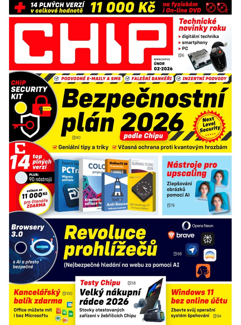 Druhé vydání Chipu roku 2026 přináší podrobný bezpečnostní plán pro uživatelská data: radíme, jak je správně třídit podle důležitosti a následně selektivně chránit, jak si udržet přehled a rozpoznat rizika. V době nasazování AI ke kriminálním účelům a nastupujícím kvantovým počítačům je správná bezpečnostní strategie důležitá pro každého. Kvůli boomu umělé inteligence a budování datových center zdražuje hardware. Zvyšování cen pamětí a procesorů se postupně přelévá do dalších oblastí digitální techniky a stranou nezůstanou ani smartphony, notebooky nebo chytré hodinky. V Chipu 02/2026 najdete 8 stran srovnávacích tabulek doplněných redakčními cenovými tipy: nákupní rádce pro začátek roku 2026 byste neměli minout bez povšimnutí. A to není vše: nabídneme vám také srovnání nástrojů pro upscaling obrázků, přehled očekávaných IT události roku 2026, rozbor schopností nových prohlížečů s AI nebo tipy na kvalitní bezplatné alternativy drahého kancelářského balíku Microsoft Office. Únorová DVD příloha je opět plná užitečných programů: Spybot Anti-Beacon pomůže s blokováním sledování uživatelských aktivit ve Windows a O&O DiskImage se spolehlivým zálohováním. Milovníkům her můžeme doporučit šikovný emulátor Hry Google Play, který umožňuje provozovat androidové hry na velké obrazovce počítače. A pokud máte čas, vyzkoušejte operační systém Zorin. Spustit ho můžete přímo z Chip DVD, nebo si podle návodu vytvořit spouštěcí disk. Může to být kandidát pro váš starší notebook s Windows 10.