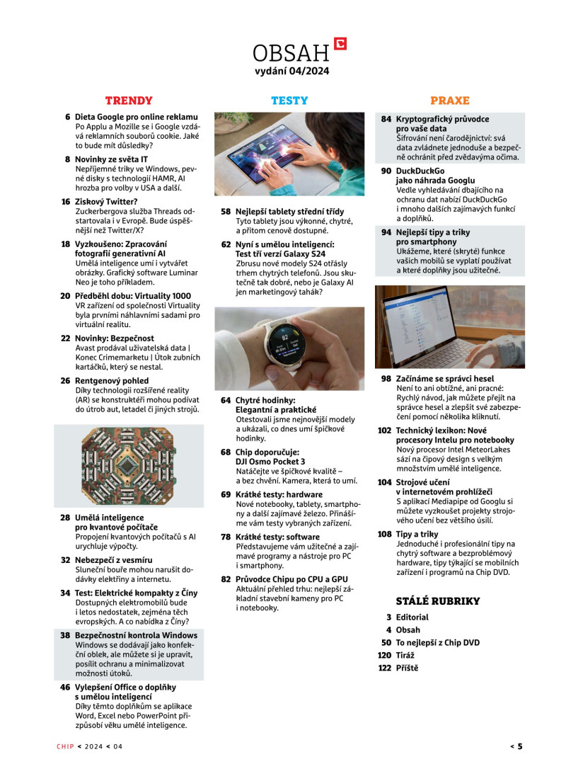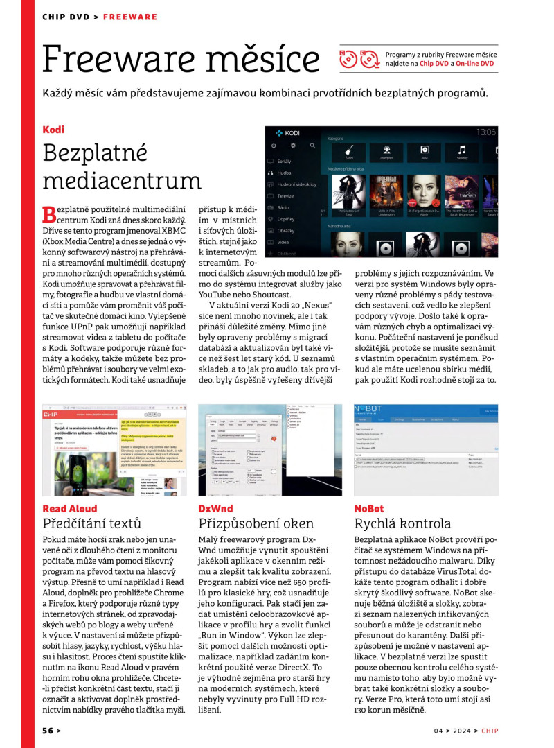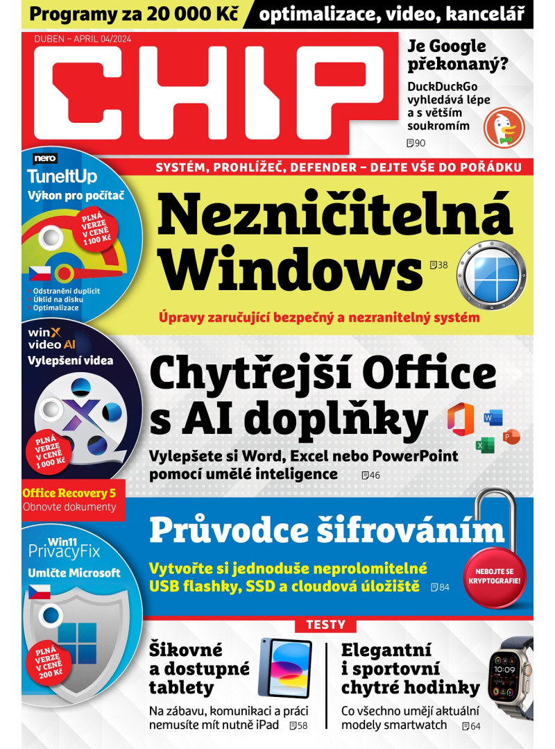 V Chipu 04/24 vám poradíme, jak si ideálně přizpůsobit svá Windows, aby odpovídala vašemu způsobu práce, a hlavně byla odolná vůči hrozbám z internetu. Udělejte si z vašeho počítače opravdu bezpečné a pohodlné místo. Pro uživatele chytrých telefonů máme připravenou sbírku nejužitečnějších tipů, které vám pomohou vylepšit funkce používané každý den. Pokud vás ubíjí moře hesel, která jste nuceni používat každý den, zkuste náš rychlý návod pro přechod na správce hesel. Zlepšíte tak své zabezpečení doslova na pár kliknutí a zjednodušíte si život. A dále na vás kromě jiného čeká návod na vylepšení Office umělou inteligencí, srovnání cenově dostupných tabletů nebo návod, jak si vyzkoušet projekty strojového učení. Pokud máte kreativní hudební sklony, můžeme vám z dubnového Chip DVD doporučit studio Cakewalk. Na opravu a vylepšení videosouborů se zase hodí Winxvideo AI a pro nahrávání hudby z rádií Audials One. Tipem redakce se stal odlehčený cloudový operační systém FydeOS, který podporuje aplikace a hry z Androidu. Program Office Recovery vám pomůže se ztracenými dokumenty a TuneItUp s optimalizací a vyčištěním systému. Nabízí ale i hodně možností, jak ušetřit místo na disku. Likviduje pozůstatky po surfování i duplicitní soubory. Užijte si hodně zajímavých informací a užitečných programů z dubnového Chipu!
