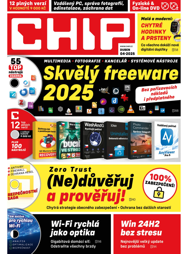 V dubnovém Chipu jsme prozkoumali stovky nejrůznějších bezplatných programů a vybrali 55 těch opravdu nejpodařenějších freewarových nástrojů, které by měly tvořit základní výbavu každého PC a vám usnadnit život. Odvedou podobnou službu jako drahé programy, jsou zaručeně zdarma a nemusíte se v jejich případě obávat ani žádného skrytého předplatného. Otestovali jsme také aktuální „trendy“ zařízení – chytré hodinky a chytré prsteny. Především ty druhé jmenované mají ambice stát se populárním doplňkem pro každého. Vyzkoušeli jsme, na co všechno stačí. Prozkoumali jsme i nabídku čteček e-knih. Mnoho z nich se už nabízí s barevným displejem a v dubnovém Chipu se dozvíte, jak velké plus to je a které modely jsou nejlepší. A zapomenout jsme nemohli ani na IT bezpečnost: profesionálové se spoléhají na strategii nulové důvěry (Zero Trust) a Chip ukáže, jak její hlavní pravidla přenést i na privátní zařízení a domácí sítě. Na přiloženém Chip DVD najdete vhodné nástroje pro uplatňování bezpečnostního standardu nulové tolerance (viz. výše). A k tomu řadu dalších zajímavých plných verzí: například aplikaci AnyViewer, s jejíž pomocí se můžete z mobilu jednoduše připojit k pracovní ploše vzdáleného počítače a kompletně jej ovládat. Program Photo Commander vám zase pomůže s tříděním, popisem a úpravou sbírky digitálních fotografií. A SD Memory Card Recovery obnoví data z paměťových karet, o které jste přišli vlastní vinou nebo selháním hardwaru.