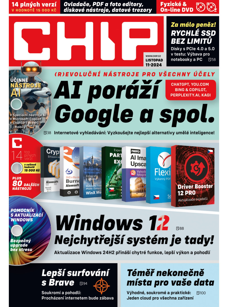 Pokud hledáte na internetu odpovědi pomocí Googlu, získáte spoustu odkazů, ale žádnou jasnou odpověď. V listopadovém vydání vám ukazujeme, že vyhledávání pomocí umělé inteligence to může výrazně změnit. Rozpozná totiž kontextové souvislosti a umí zpracovat přirozený jazyk. Vyzkoušeli jsme několik nástrojů a nabídneme vám lákavé varianty. Rozebíráme také současnou situaci v „čipové válce“ mezi USA a Čínou i to, jak ovlivňuje Evropu, a tedy i nás. Ve srovnávacích testech jsme se věnovali M.2 SSD diskům s rozhraním PCIe. S námi si vyberete ten nejvhodnější a navrch vám poradíme, jak s ním účinně upgradovat váš notebook. A zajímat vás možná také bude naše testování repasovaných iPhonů a Samsungů Galaxy. Výsledky budou pro ty, kteří o výhodných nákupech použitých smartphonů uvažují, hodně důležité. Nezapomněli jsme ani na Windows, rozebíráme všechny novinky jejich nejnovější podzimní aktualizace. Poradíme lepší prohlížeč pro bezpečné a komfortní surfování a přinášíme také návody, jak pohodlně nastavit cloudové úložiště nebo si vytvořit úplně vlastní cloud. Listopadový Chip DVD toho také přináší požehnaně, těšit se můžete na 14 plných verzí v celkové hodnotě 15 tisíc Kč: nástroj Driver Booster 12 na aktualizaci ovladačů, PDF editor FlexiPDF s českým rozpoznáváním skenovaného textu, Nero AI Image Upscaler pro vylepšování a retuše fotografií a profesionální nástroj Partition Expert na správu HDD a SSD. Většina plných verzí má také českou lokalizaci, takže se v nich lépe zorientujete.