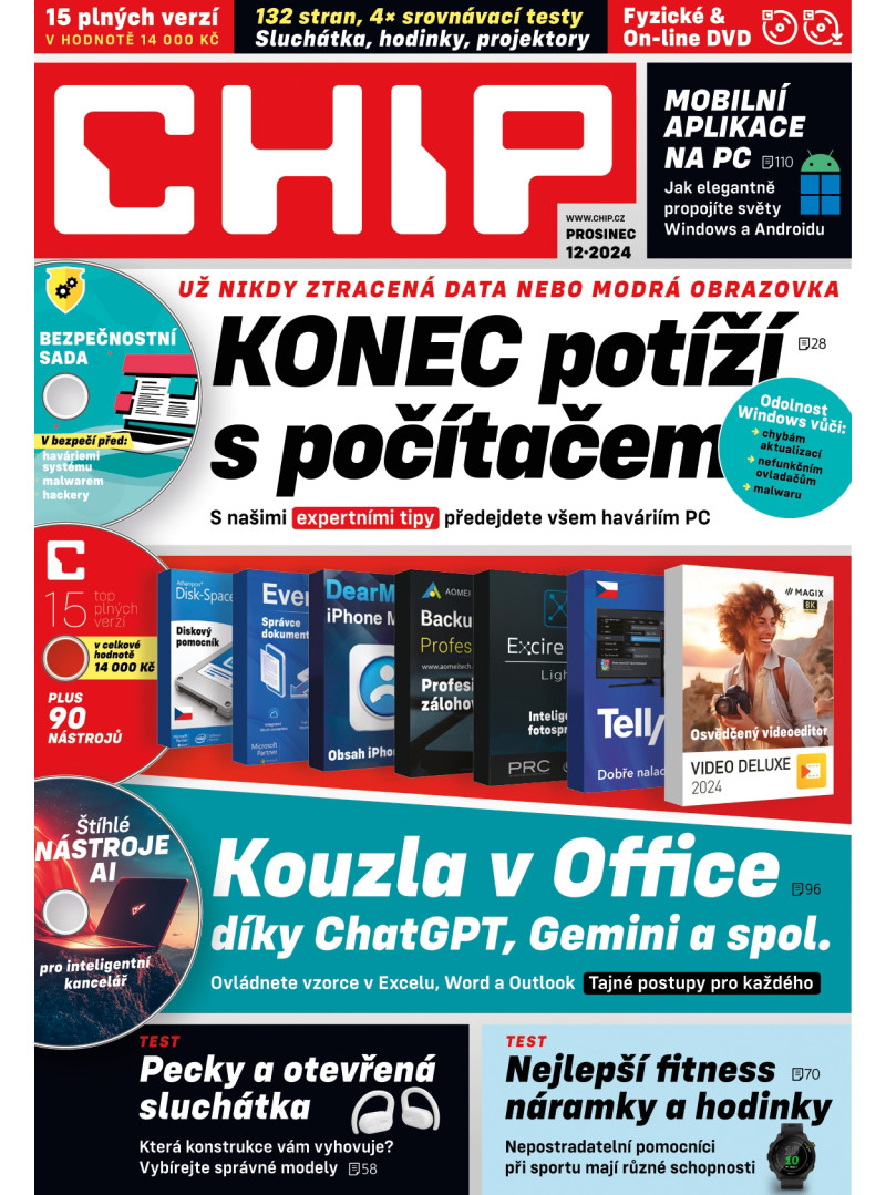 Dnešní počítače s novými Windows jsou už přeci jen spolehlivější. Přesto vás mohou malware, vadný hardware, nefunkční ovladače nebo chyby v aktualizacích pěkně potrápit. V prosincovém Chipu ukážeme, jak se správně chránit, a když už k nějakým potížím dojde, tak jak je vyřešit a rychle vrátit stroj do provozu. Kancelářský balík od Microsoftu používáme skoro všichni. Možná ale nevíte, že v Excelu, Wordu nebo Outlooku za vás mohou nástroje s umělou inteligencí odvést spoustu práce: zvládnou provádět rutinní úkoly rychleji, vytvářet tabulky nebo vysvětlovat vzorce. Chip poradí, jak na to. Vzhledem k tomu, že se blíží Vánoce, připravili jsme do prosincového vydání také řadu srovnávacích testů zařízení, o kterých možná budete uvažovat pod stromeček: otevřená sluchátka a TWS pecky, špičkové projektory pro domácí kino, sportovní trackery i hodinky s GPS a navrch ještě praktické napájecí baterie AA s integrovaným USB-C portem. Na nový DVD se nám toho taky vešlo opravdu hodně: plná verze správce fotografií Excire Foto umí pomocí umělé inteligence rozpoznávat obsah obrázků, popsat ho značkami a následně podle nich snímky rychle vyhledávat. EverDoc slouží k archivaci a přehlednému třídění dokumentů na PC i v cloudu, kde lze použít propojený mobilní telefon pro pořizování skenů. Telly je internetová televize s více než stovkou stanic, které můžete sledovat v reálném čase i ze záznamu několik dní zpětně.