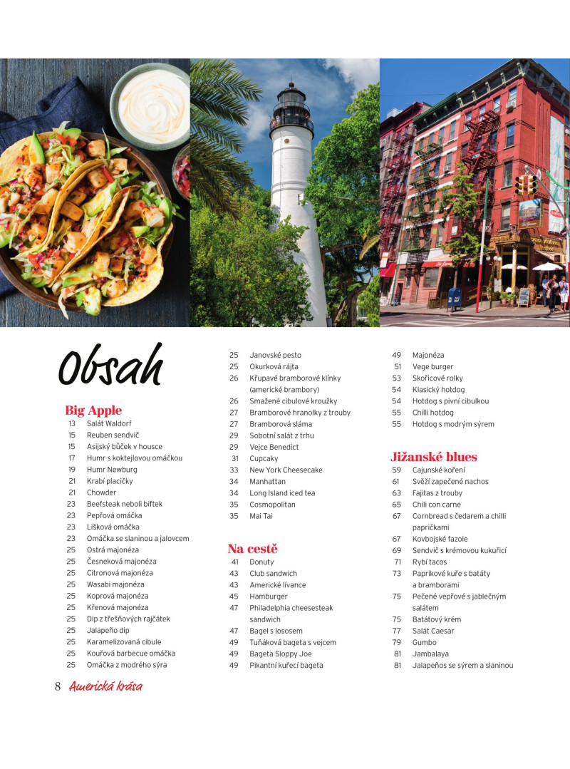 Americká krása aneb Objevte všechny chutě Nového světa obsahuje více než 120 redakcí důkladně prověřených receptů. Po kulinárních výletech do Itálie, Asie, Francie, Řecka a Latinské Ameriky a prozkoumání pokladů českých luhů a hájů se vypravíme na cestu za Atlantský oceán a odhalíme tajemství americké kuchyně. Vydejte se spolu s námi na bezstarostnou jízdu a objevte všechny chutě Spojených států! Amerika není jen domovem hamburgerů, hotdogů, donutů a splněných amerických snů. Zrodily se tu slavné recepty na vejce Benedict, salát Caesar a spousty známých sendvičů, dezertů a dalších dobrot. Procestovali jsme USA křížem krážem, abychom pro vás všechny tyhle recepty posbírali a zapsali do jedné knihy. Najdete v ní všechno, co potřebujete z kuchyní amerických hospodyněk, proslulých bister i věhlasných restaurací znát. Naučíme vás v ní grilovat na americký způsob, upéct nejlepší jablečný páj i newyorský cheesecake a prozradíme to nejlepší z kuchyně tex-mex.
