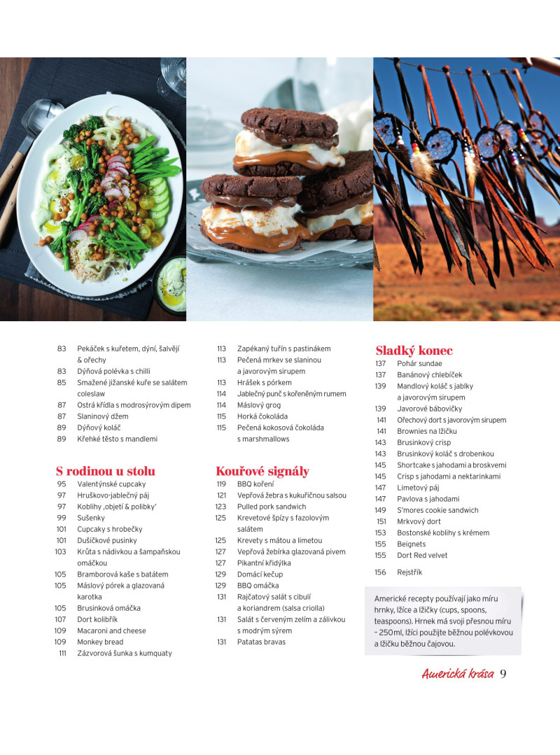 Amerika není jen domovem hamburgerů, hotdogů, donutů a splněných amerických snů. Zrodily se tu slavné recepty na vejce Benedict, salát Caesar a spousty známých sendvičů, dezertů a dalších dobrot. Procestovali jsme USA křížem krážem, abychom pro vás všechny tyhle recepty posbírali a zapsali do jedné knihy. Najdete v ní všechno, co potřebujete z kuchyní amerických hospodyněk, proslulých bister i věhlasných restaurací znát. Naučíme vás v ní grilovat na americký způsob, upéct nejlepší jablečný páj i newyorský cheesecake a prozradíme to nejlepší z kuchyně tex-mex.