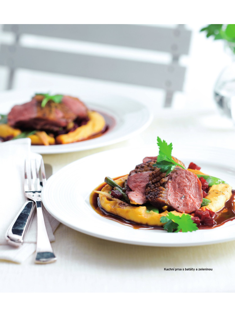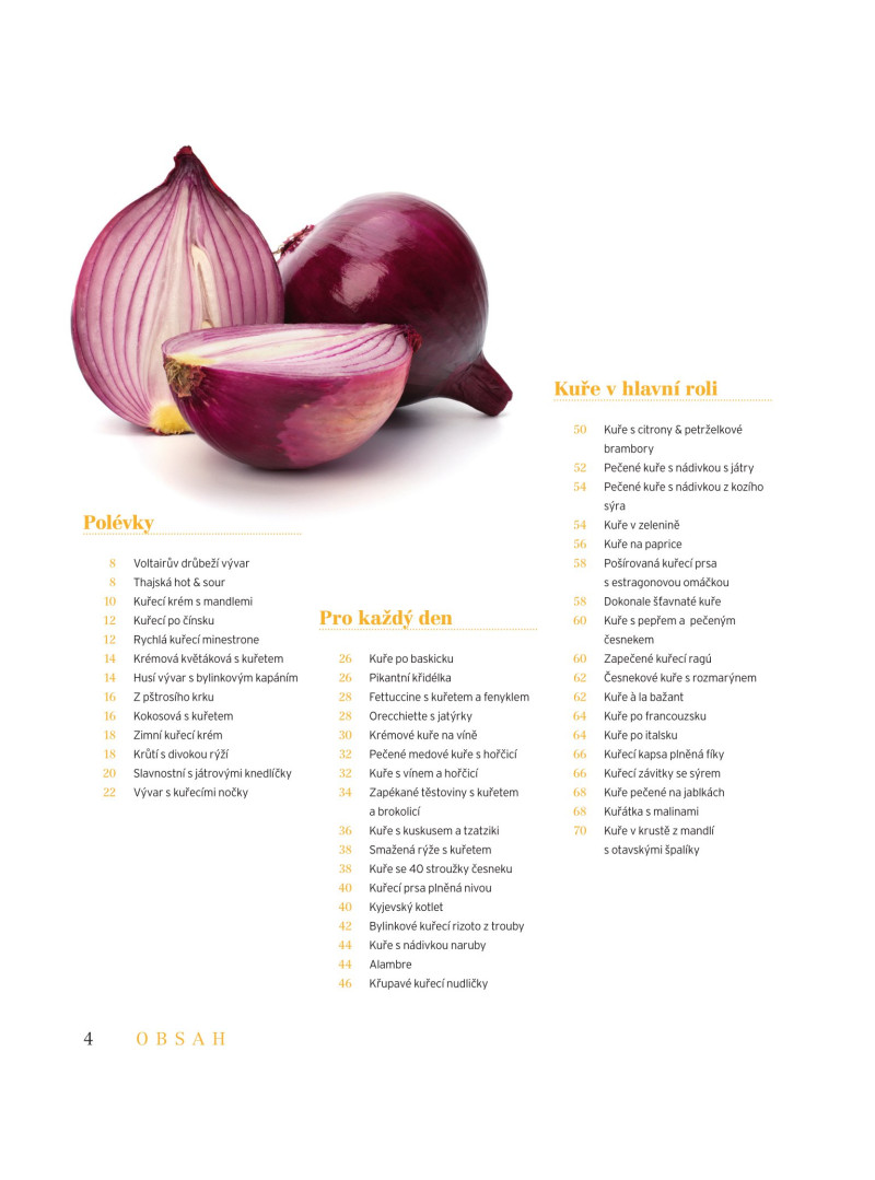 Mezi 110 recepty si vyberou úplní začátečníci, ale díky spoustě nových nápadu se nebudou nudit ani ti, kteří se ve vaření vyznají. Kuchařka je totiž plná rychlých večeří pro každý den, slavnostních pečínek, neotřelých polévek a exotických lahůdek. Nechybí ani recepty na chutné přílohy a nádivky a praktické tipy, jak vybírat suroviny a na co si při jejich nákupu dávat pozor. Kapitola Servis obsahuje podrobný návod na porcování a vykostění kuřete a spoustu triků a zlepšováků.