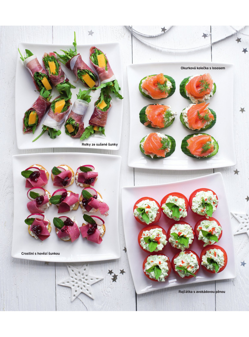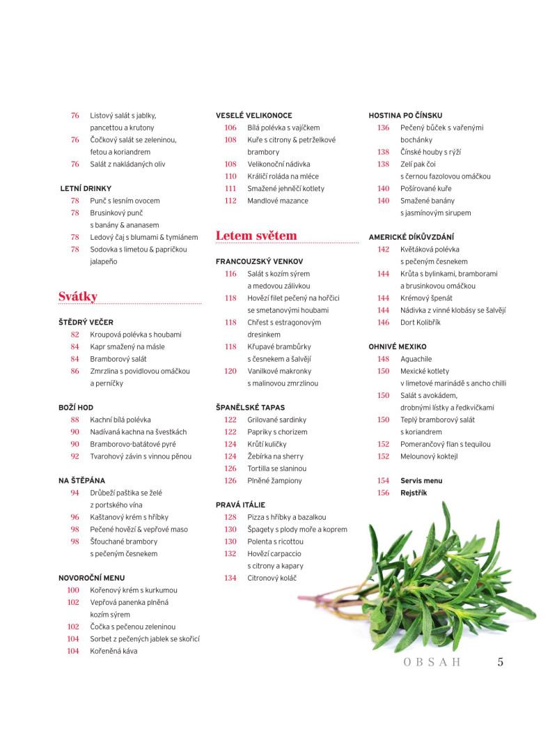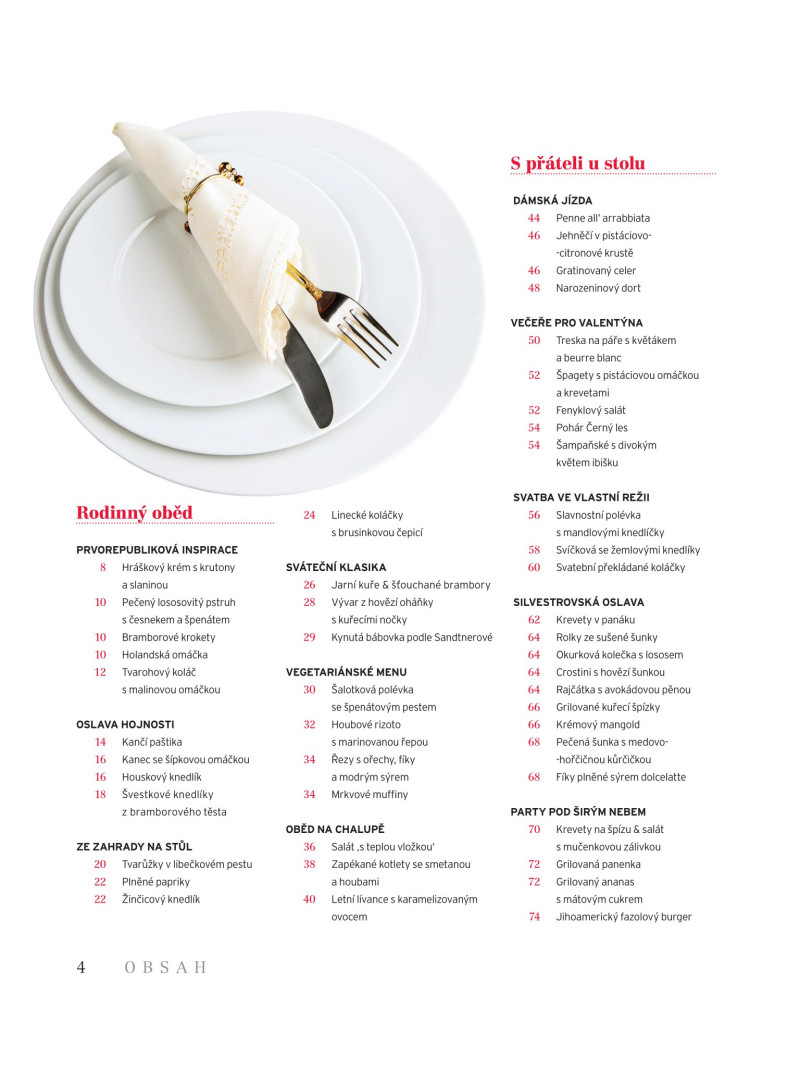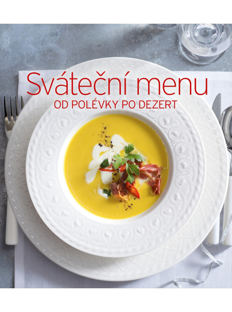 Ve čtyřech tematicky rozdělených kapitolách vám nabízíme 103 receptů na dokonale vyladěná menu o několika chodech a pro každou příležitost – klasiku na neděli, na Velikonoce, vánoční svátky, svatbu, Nový rok i menu, které zvládnete uvařit na chalupě, či pořádnou hostinu pod širým nebem. Jedno menu je klasické a hotové do 30 minut, další nové a svěží, jiné opulentní… Recepty si tu vyberou všichni – začátečníci i pokročilí, milovníci české i světové kuchyně. A pamatujeme i na vegetariány.