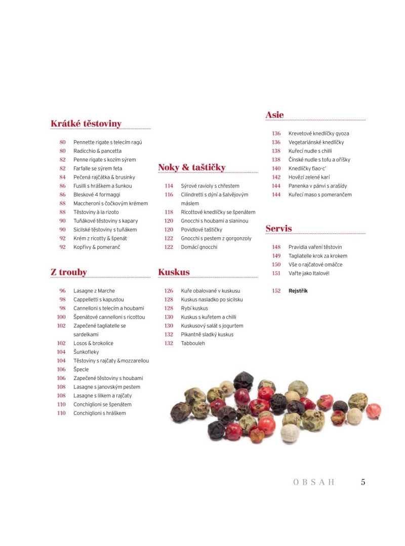 Devátá kuchařka Těstoviny z Edice Apetit nabízí přes 100 ověřených receptů. Díky této kuchařce z Edice Apetit se naučíte připravovat úplné pilíře italské kuchyně jako je omáčka bolognese, janovské pesto, špagety carbonara, aglio e olio, ale také zapékat různé druhy těstovin, vařit s nimi polévky, připravovat z nich saláty, dobře ochutit kuskus a získáte spoustu nápadů, jak během pár minut udělat jídlo, na kterém si pochutná celá rodina.